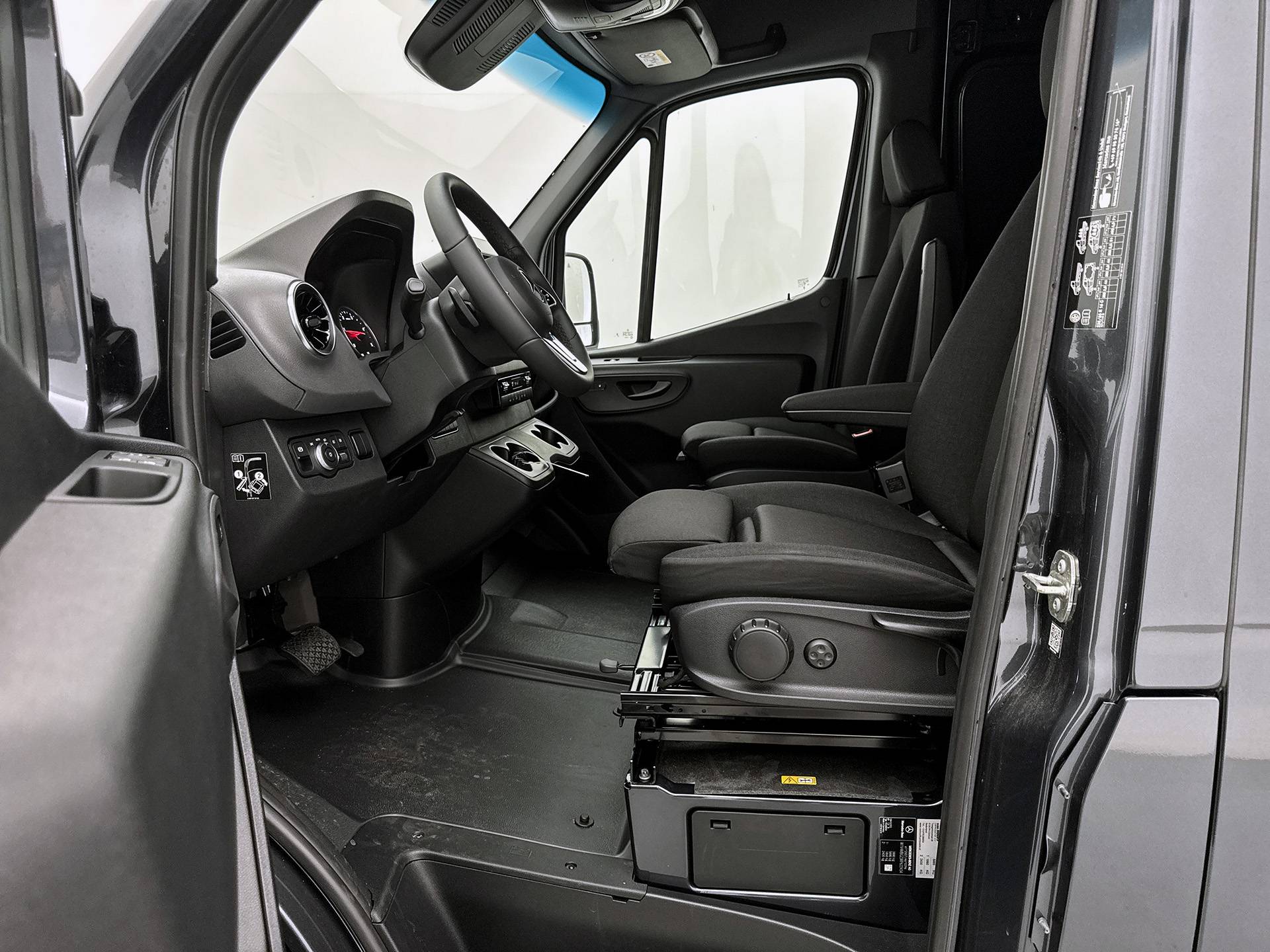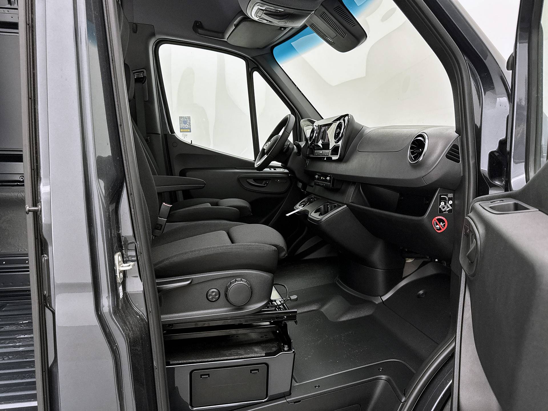 Ook praktisch: de voorstoelen zijn 180 graden draaibaar, ideaal voor overleg of laptopwerk onderweg.