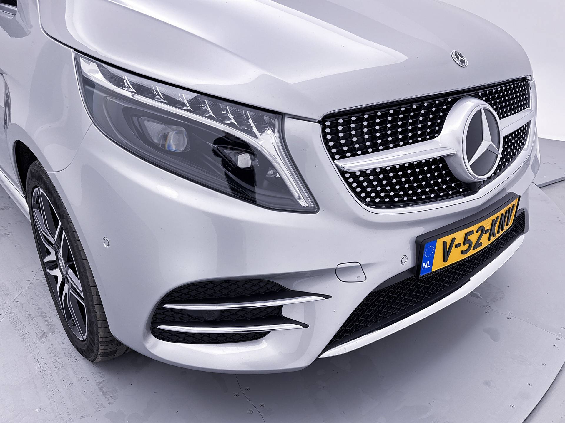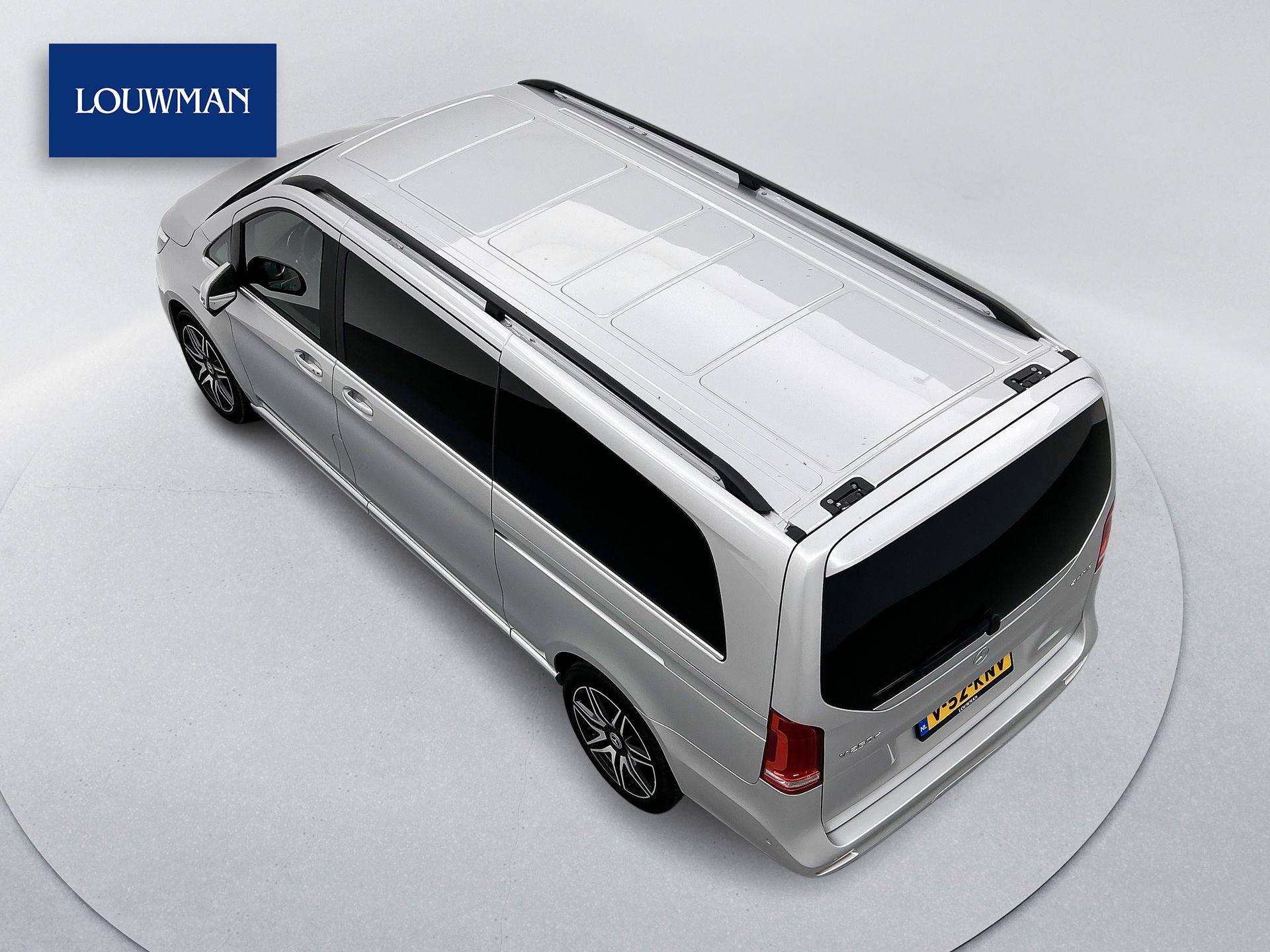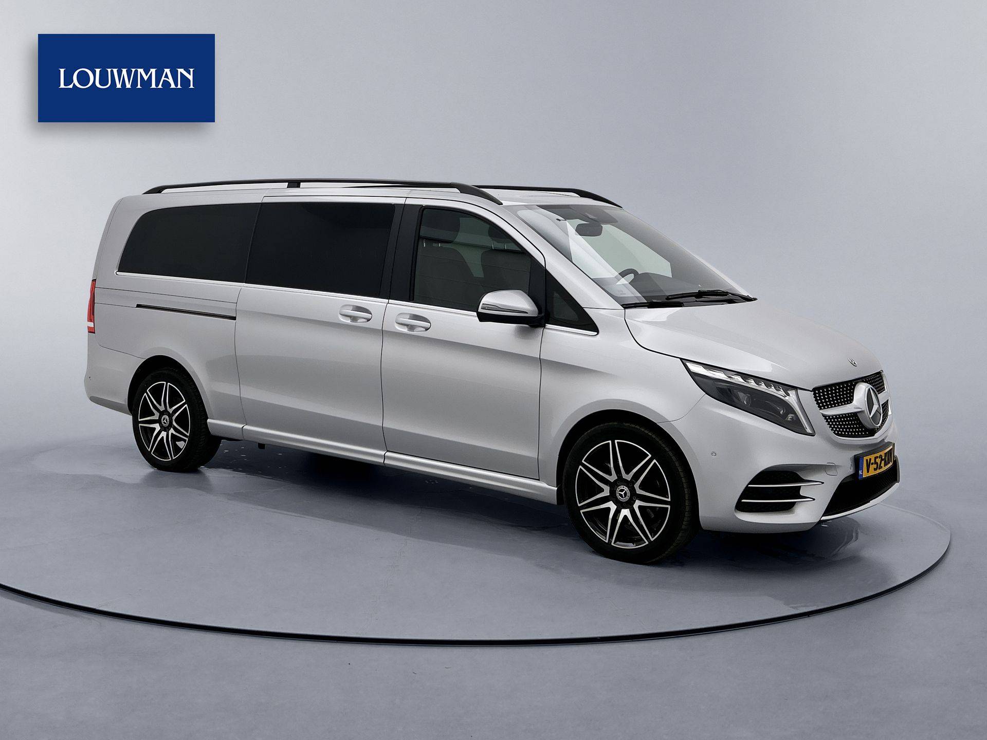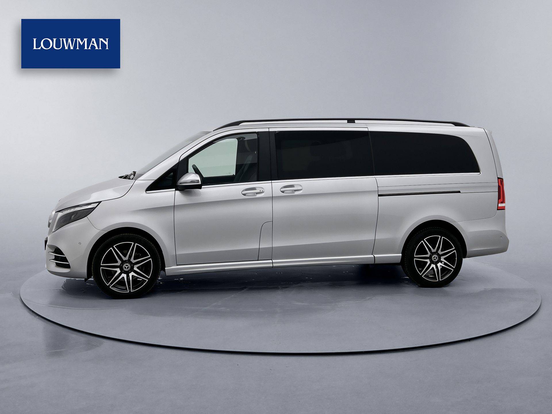 Deze V-Klasse is uitgevoerd in stijlvol licht zilver metallic en voorzien van het AMG Styling-pakket, inclusief 19-inch lichtmetalen velgen en sportieve styling, wat zorgt voor een dynamische uitstraling.