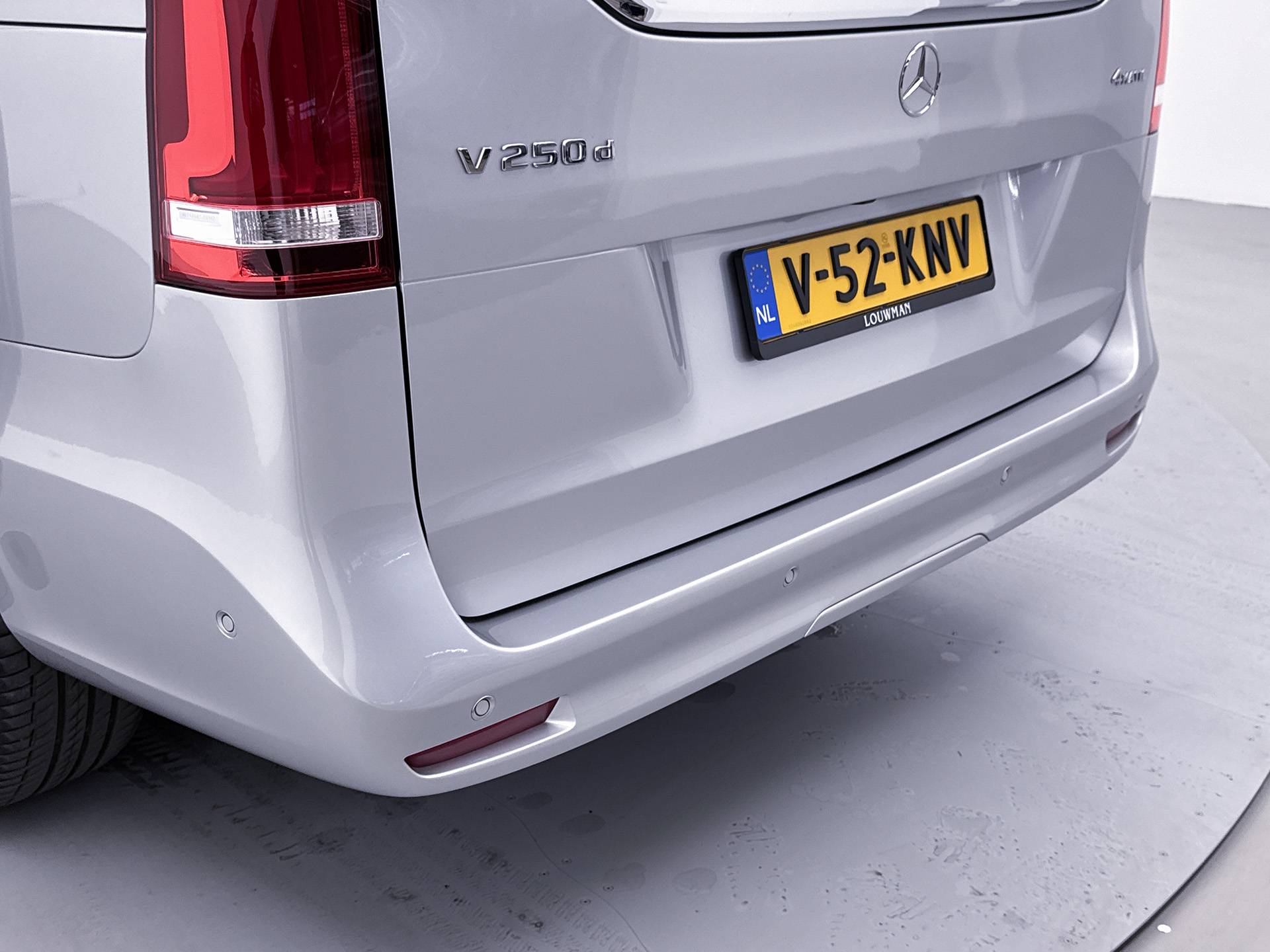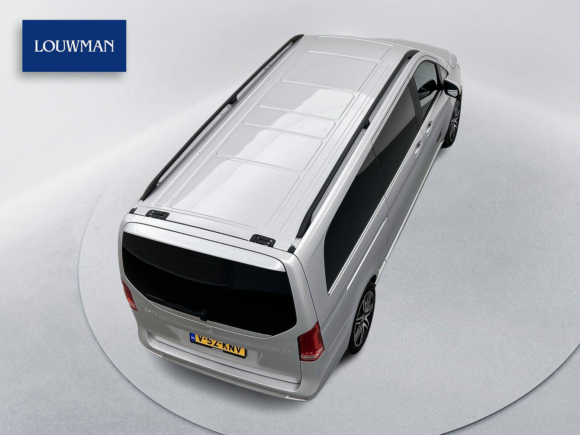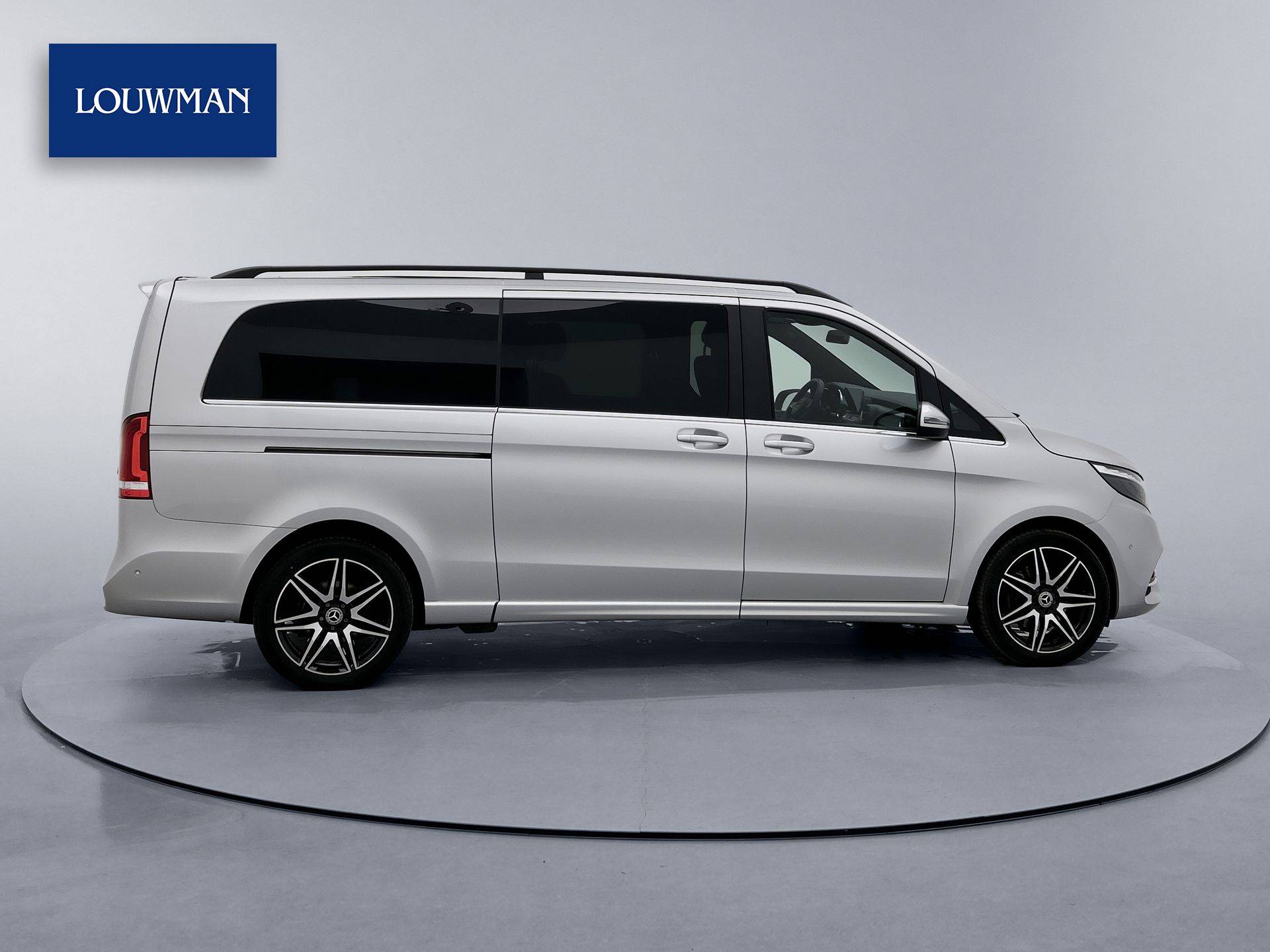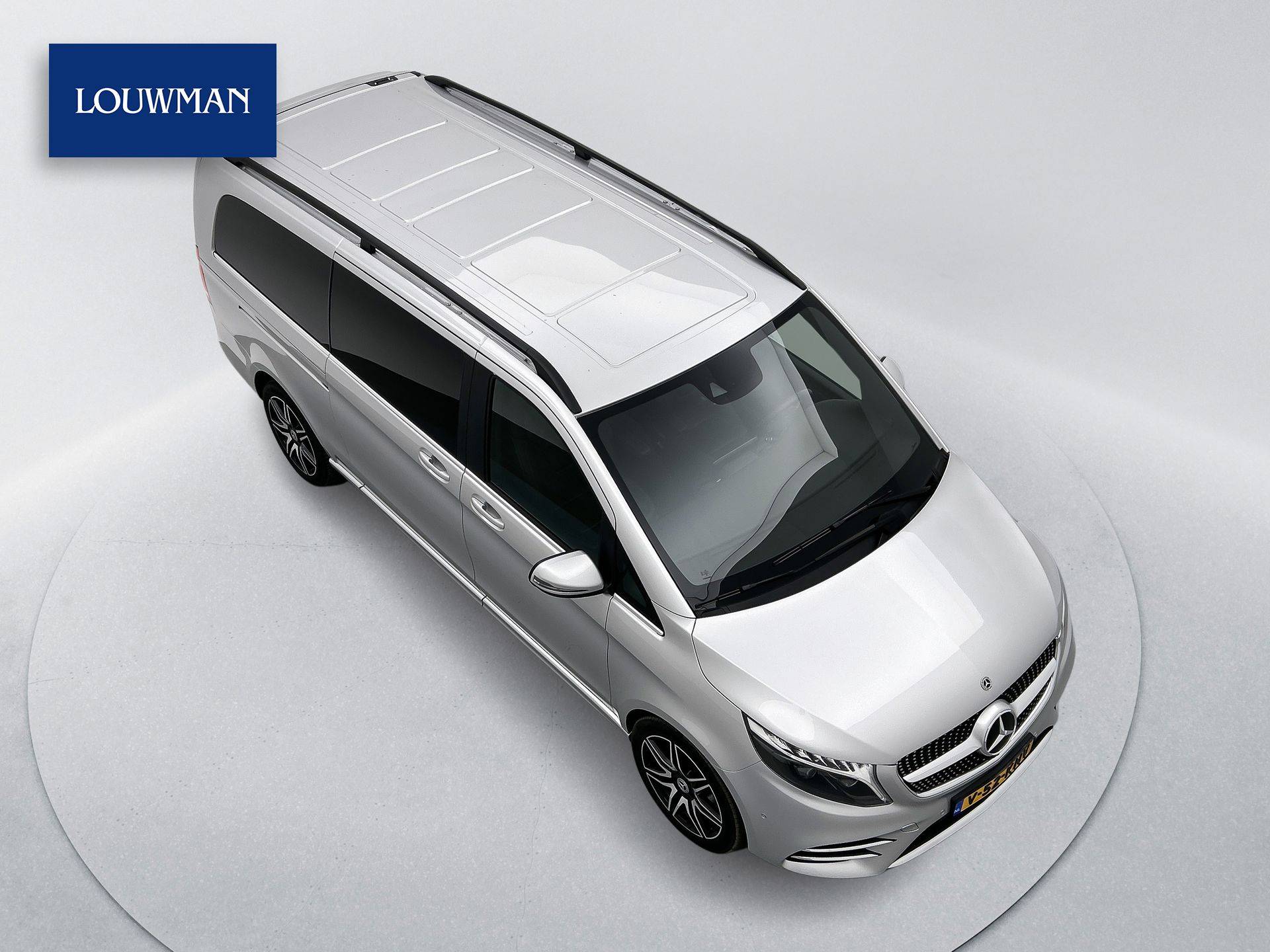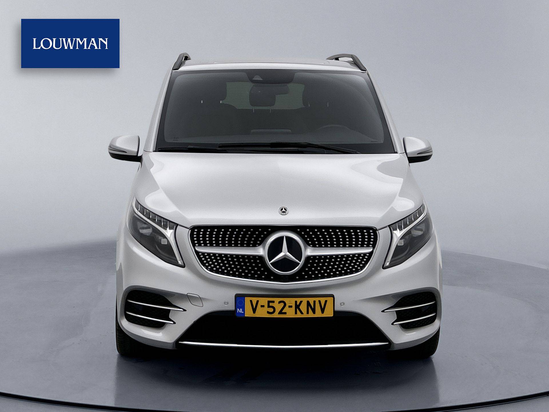 Deze V-Klasse is uitgevoerd in stijlvol licht zilver metallic en voorzien van het AMG Styling-pakket, inclusief 19-inch lichtmetalen velgen en sportieve styling, wat zorgt voor een dynamische uitstraling.