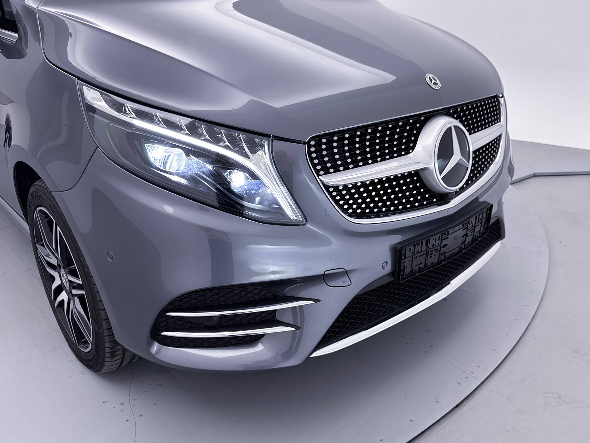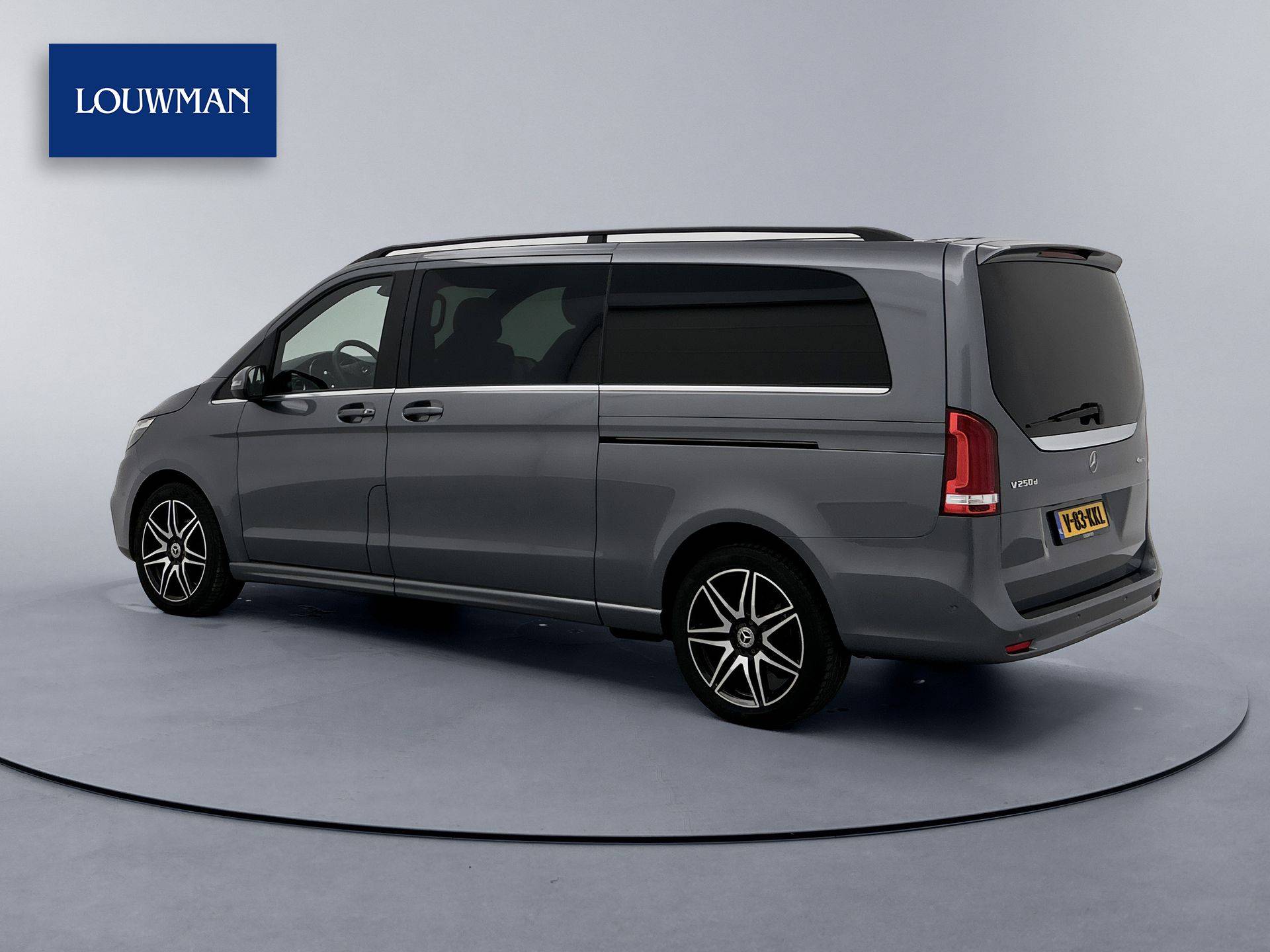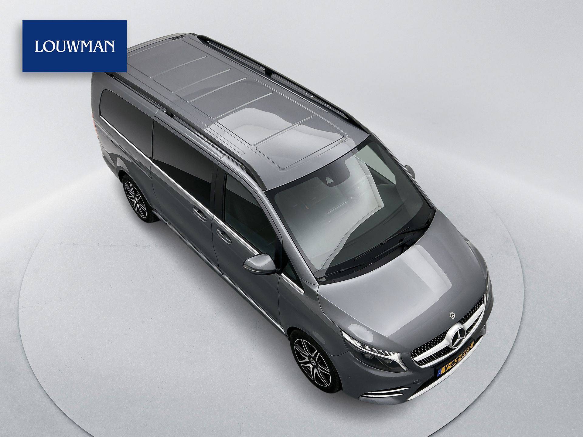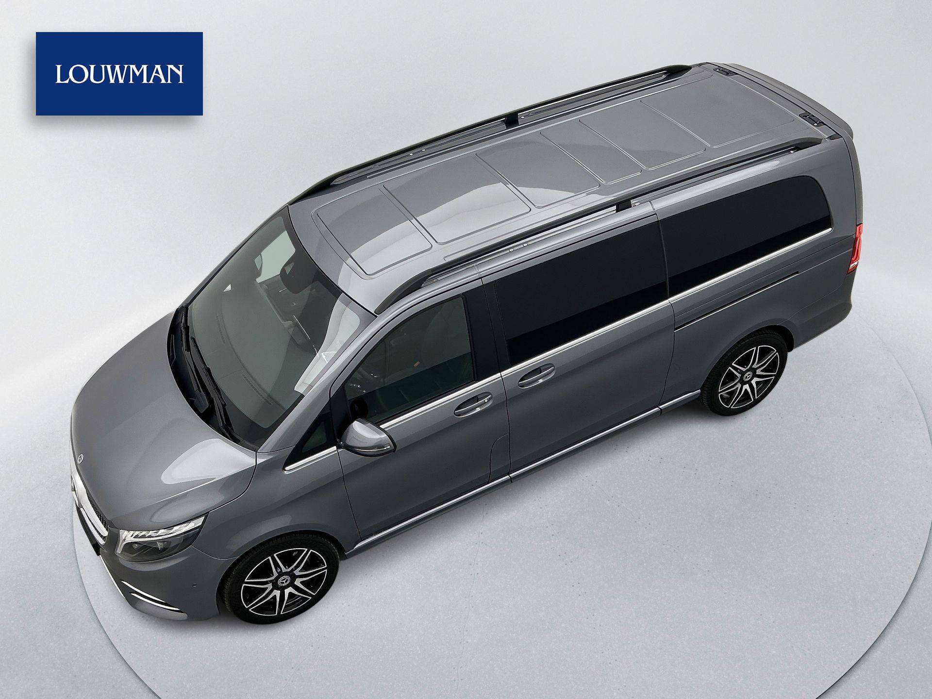 Deze V-Klasse is uitgevoerd in stijlvol grijs metallic en voorzien van het AMG Styling-pakket, inclusief 19-inch lichtmetalen velgen en sportieve styling, wat zorgt voor een dynamische uitstraling.