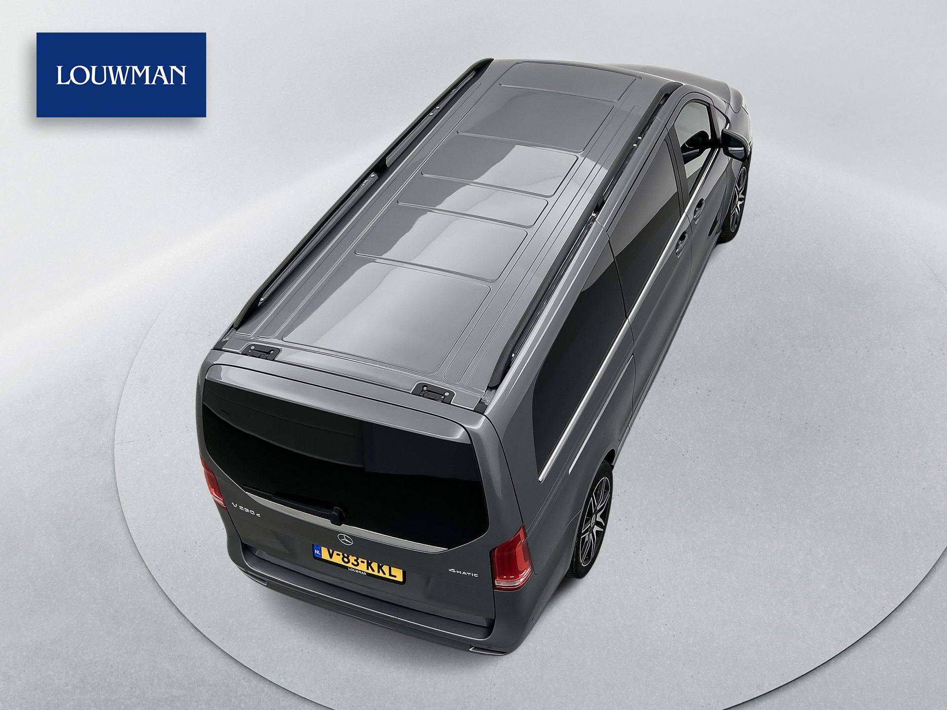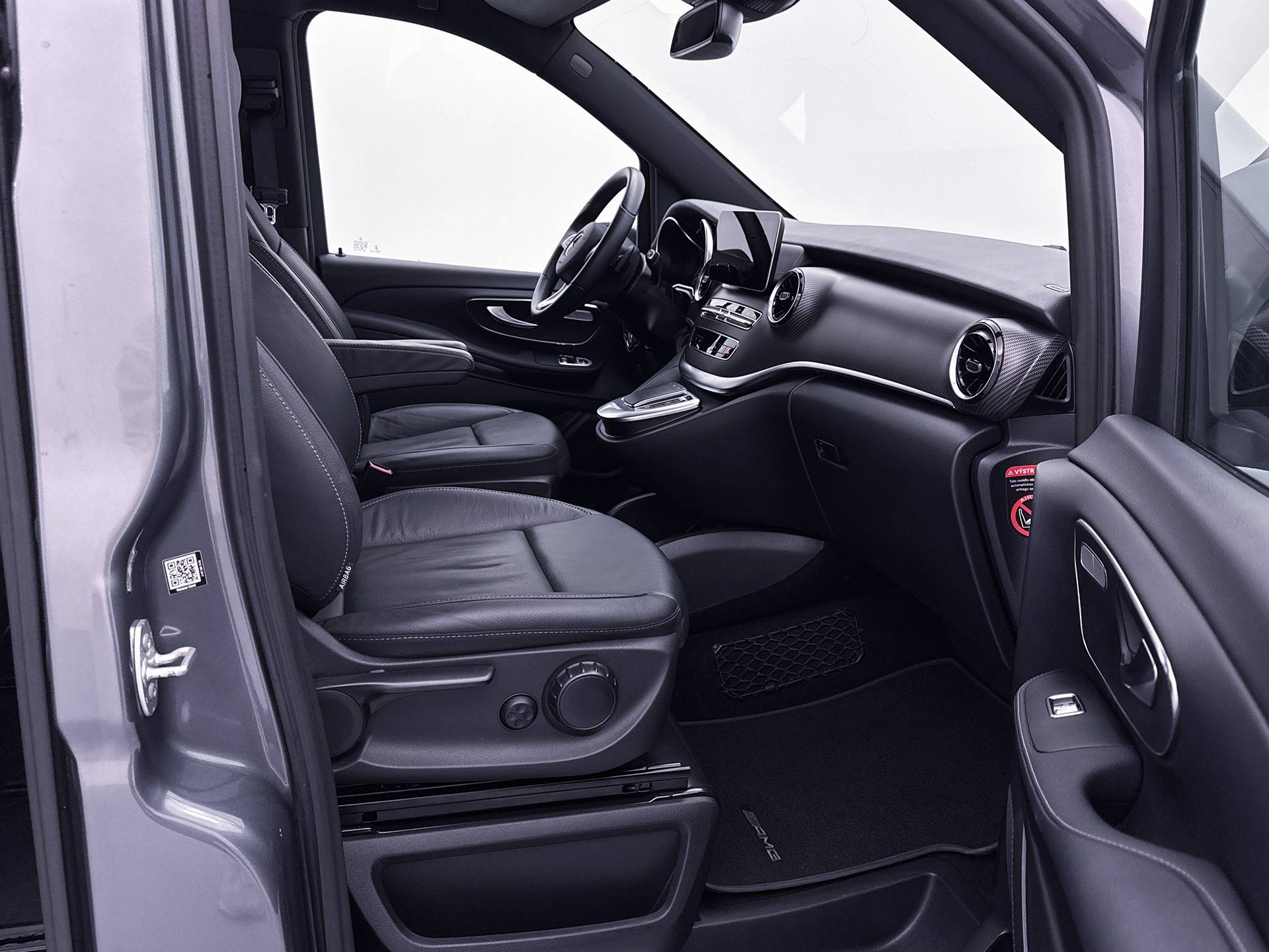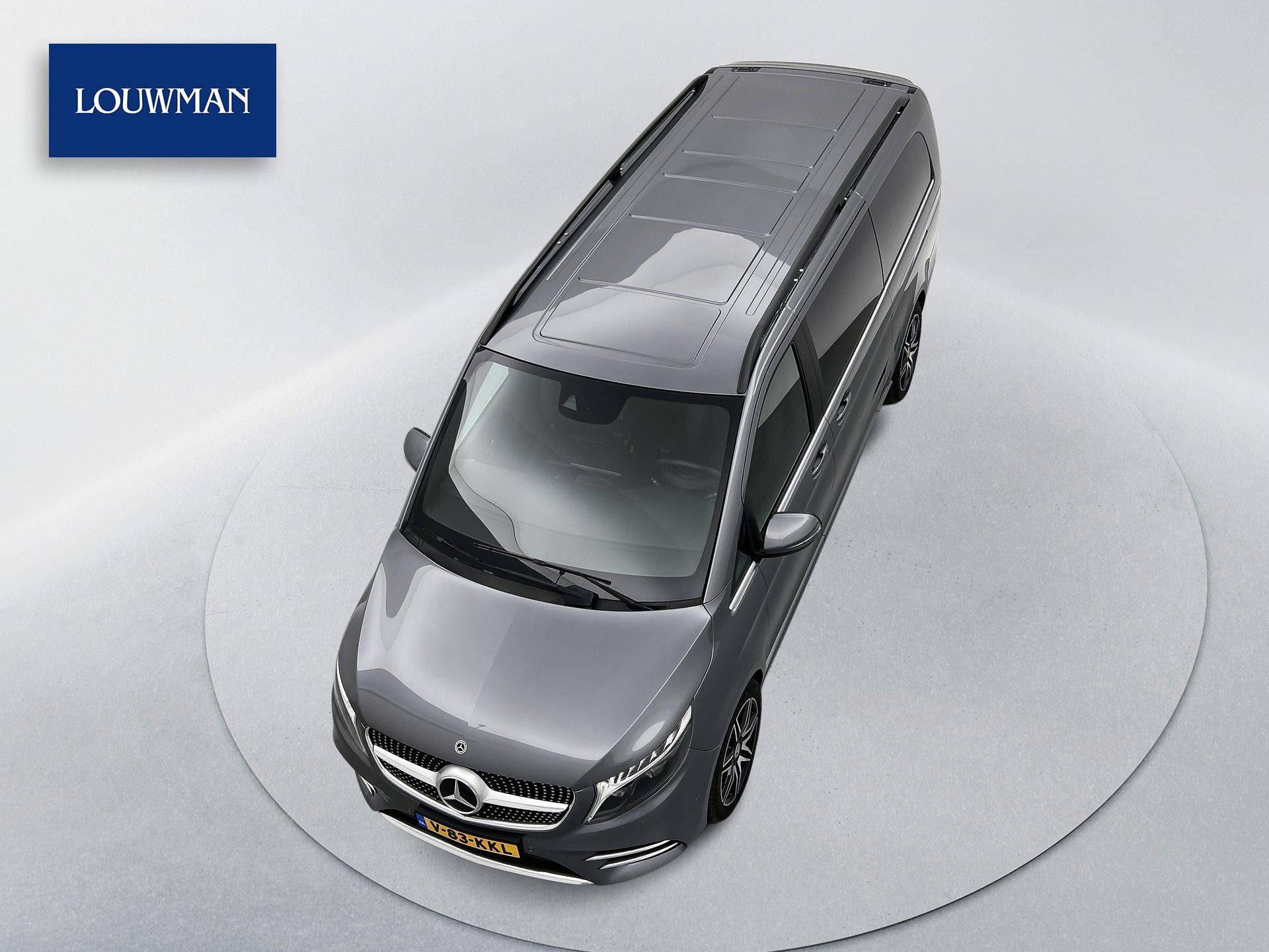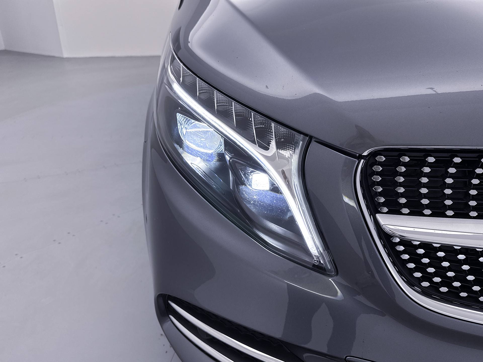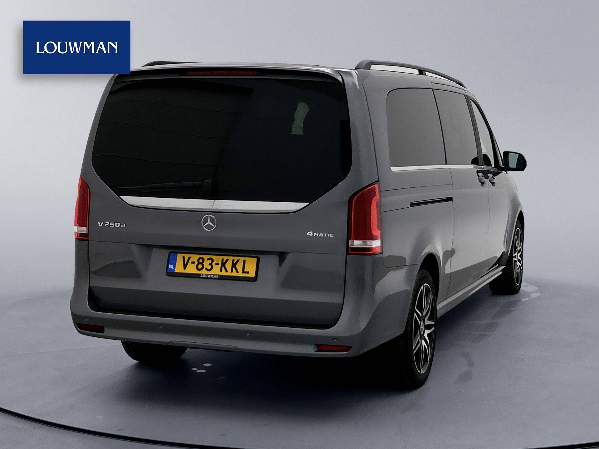 Deze V-Klasse is uitgevoerd in stijlvol grijs metallic en voorzien van het AMG Styling-pakket, inclusief 19-inch lichtmetalen velgen en sportieve styling, wat zorgt voor een dynamische uitstraling.