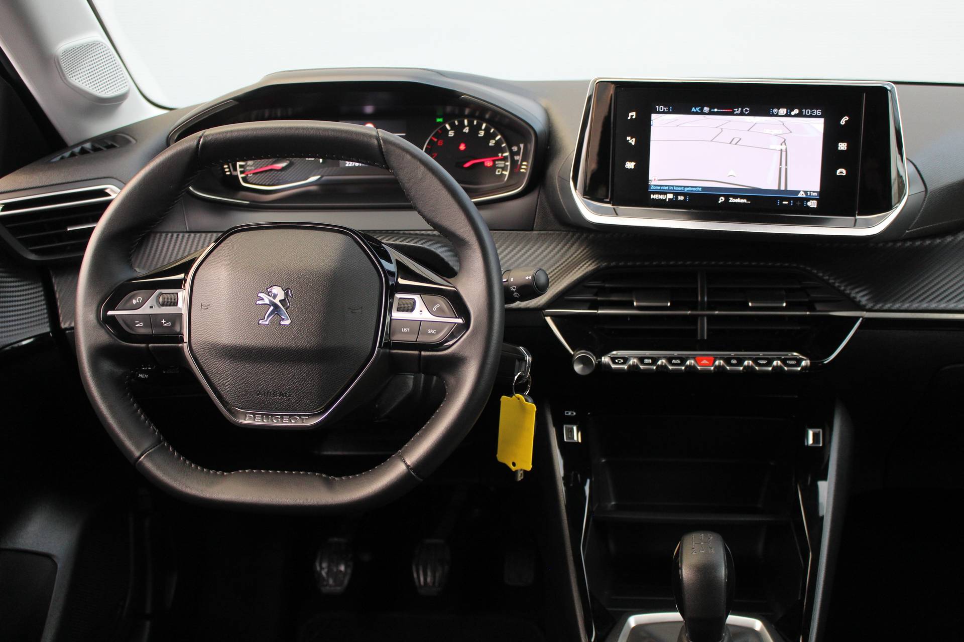 Dashboard in zacht materiaal met carboneffect en hoogglans zwarte sierstrip met chromen bies