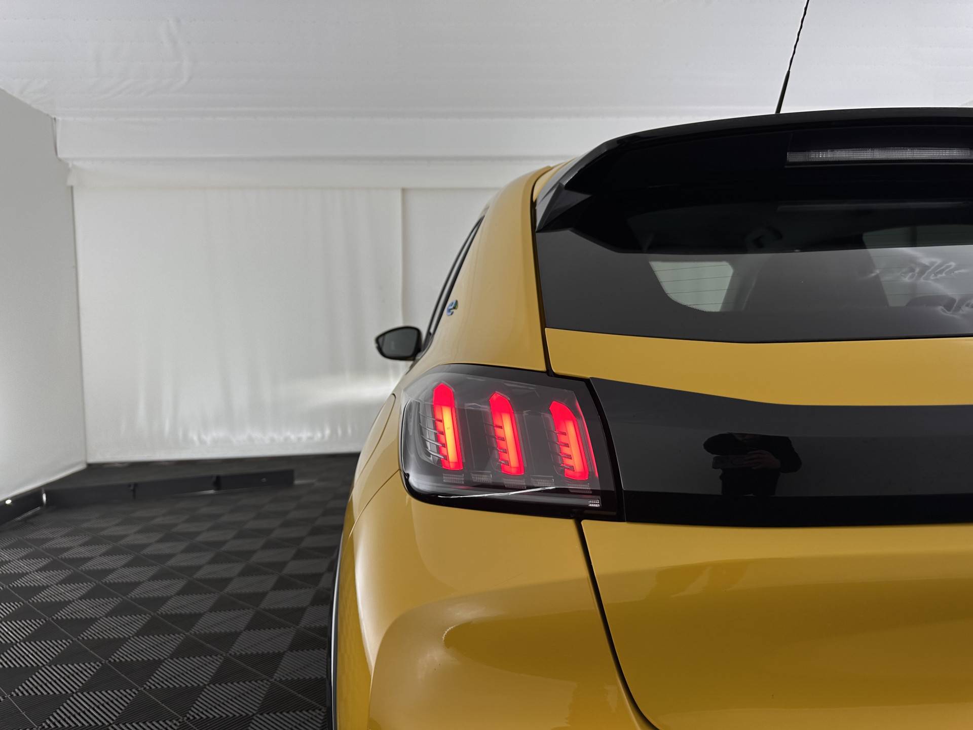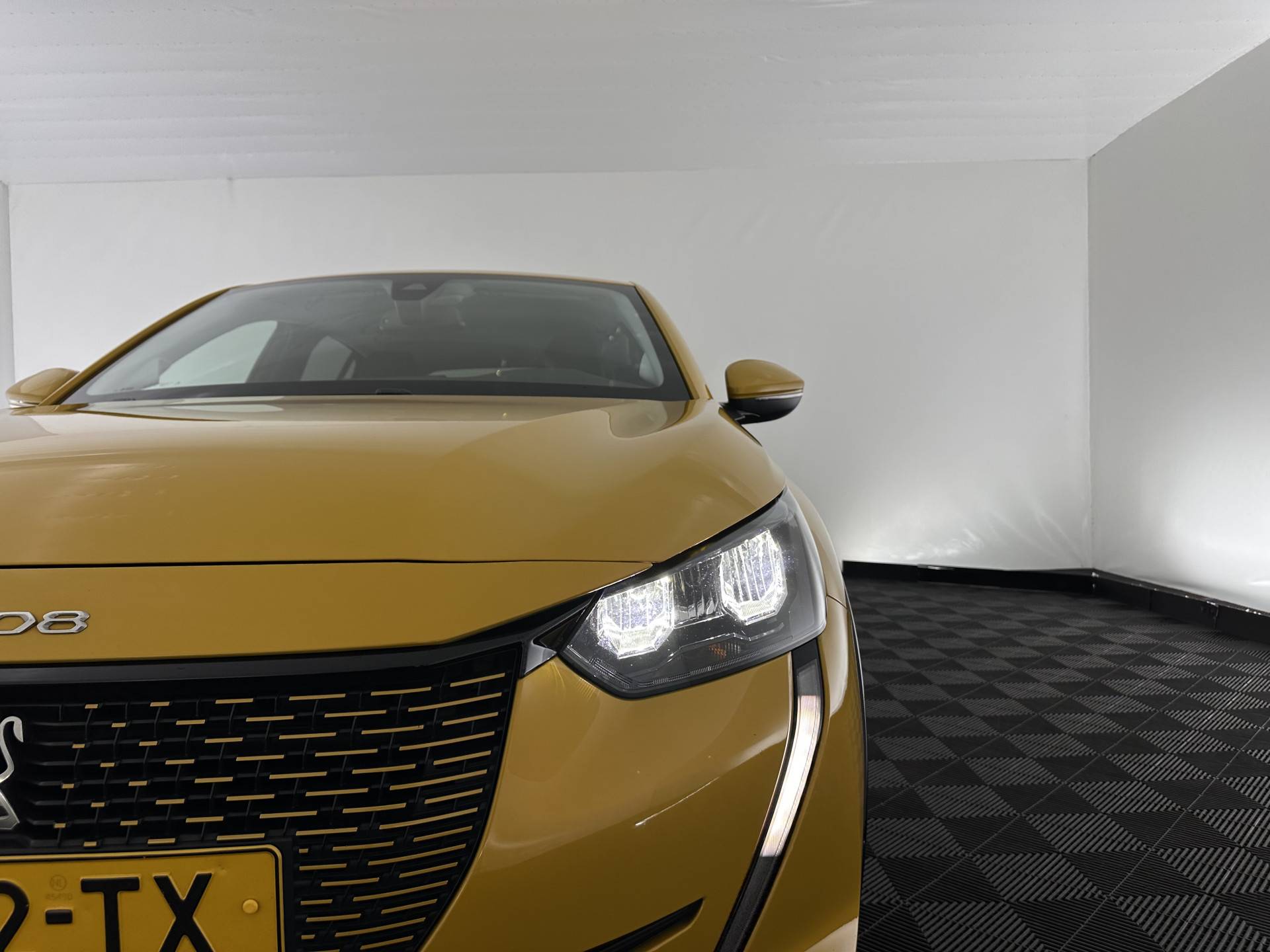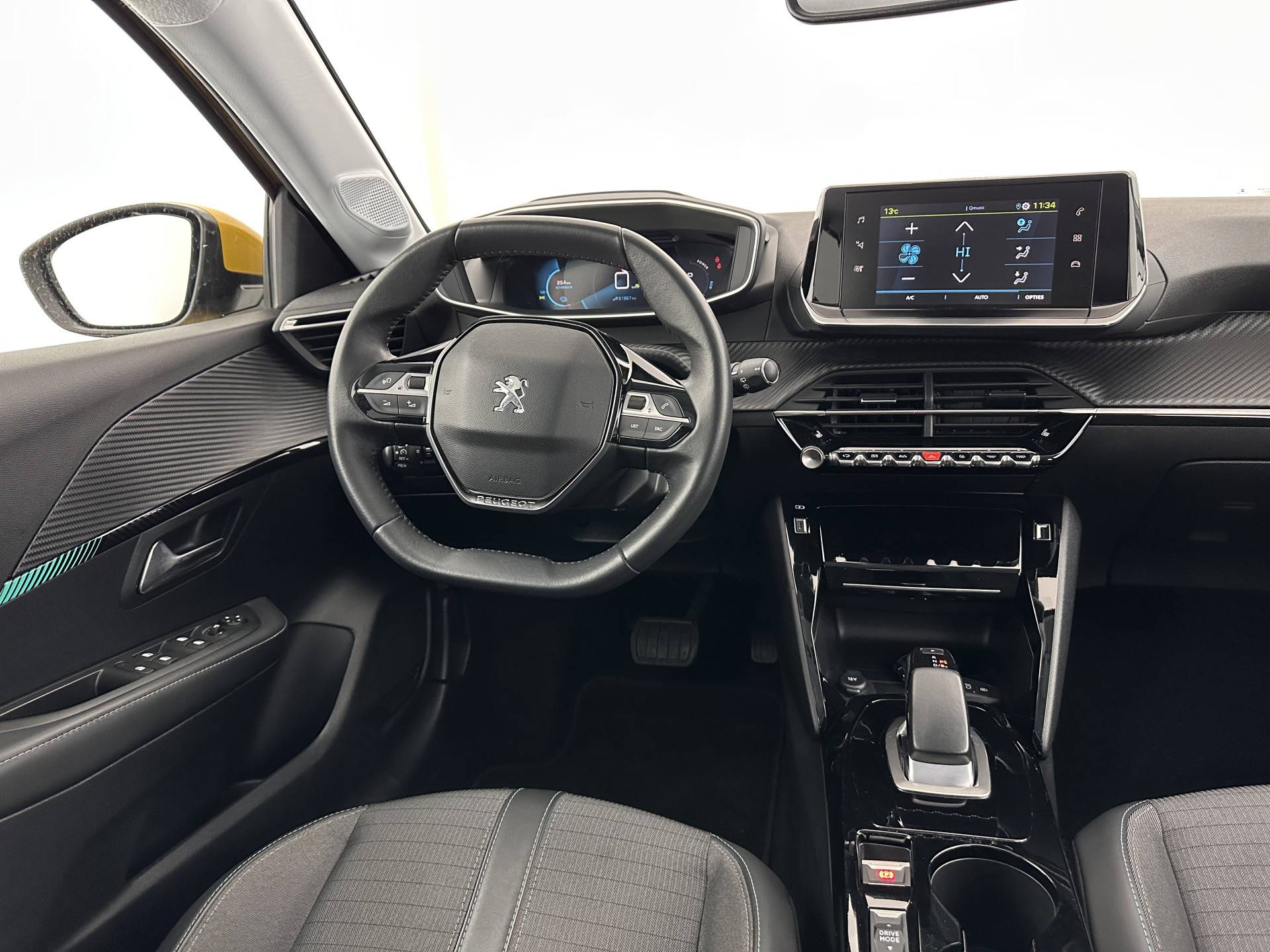 ⭐ Peugeot e-208 EV Allure Pack 50 kWh [ 3-Fase-11kW ] {SOH-89%} in Jaune Faro Metallic met stof/vegan-leder "Cozy" in zwart | Compact, Elektrisch & Stijlvol