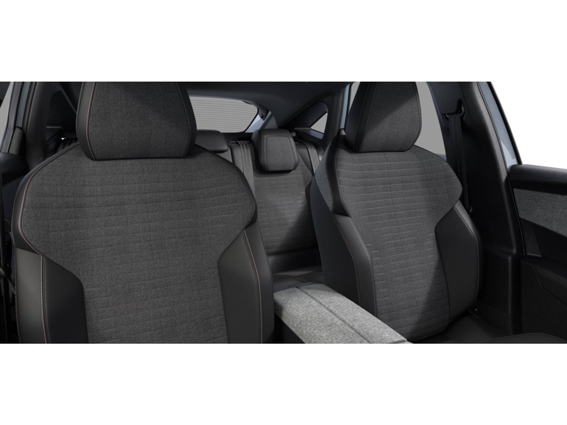 ✓ Middenconsole bekleed met gemêleerde stof RIMINI, glanzend zwart frontpaneel , strip in Stene Grey en armleuning bekleed met gemêleerde stof RIMINI