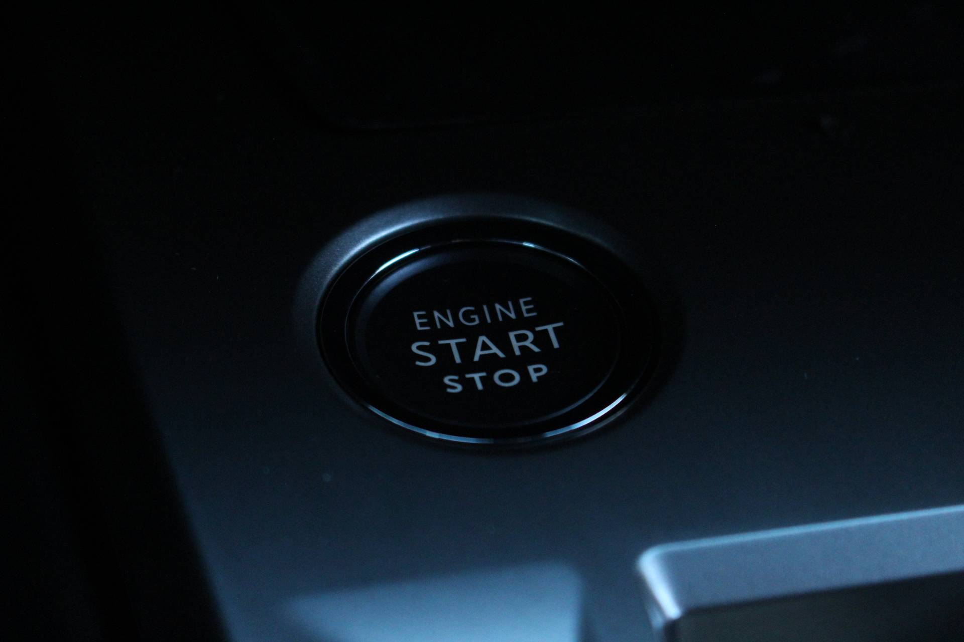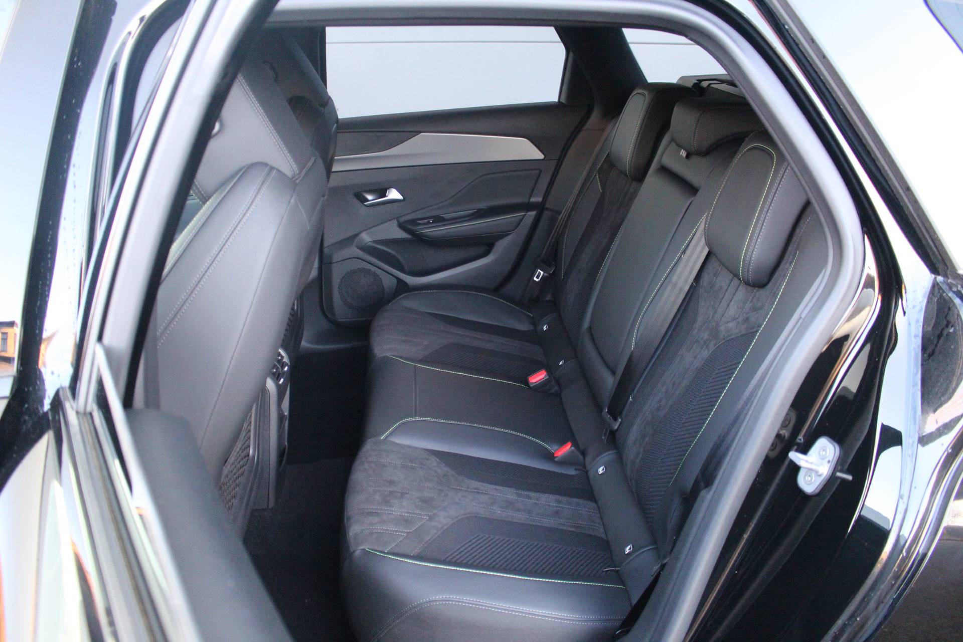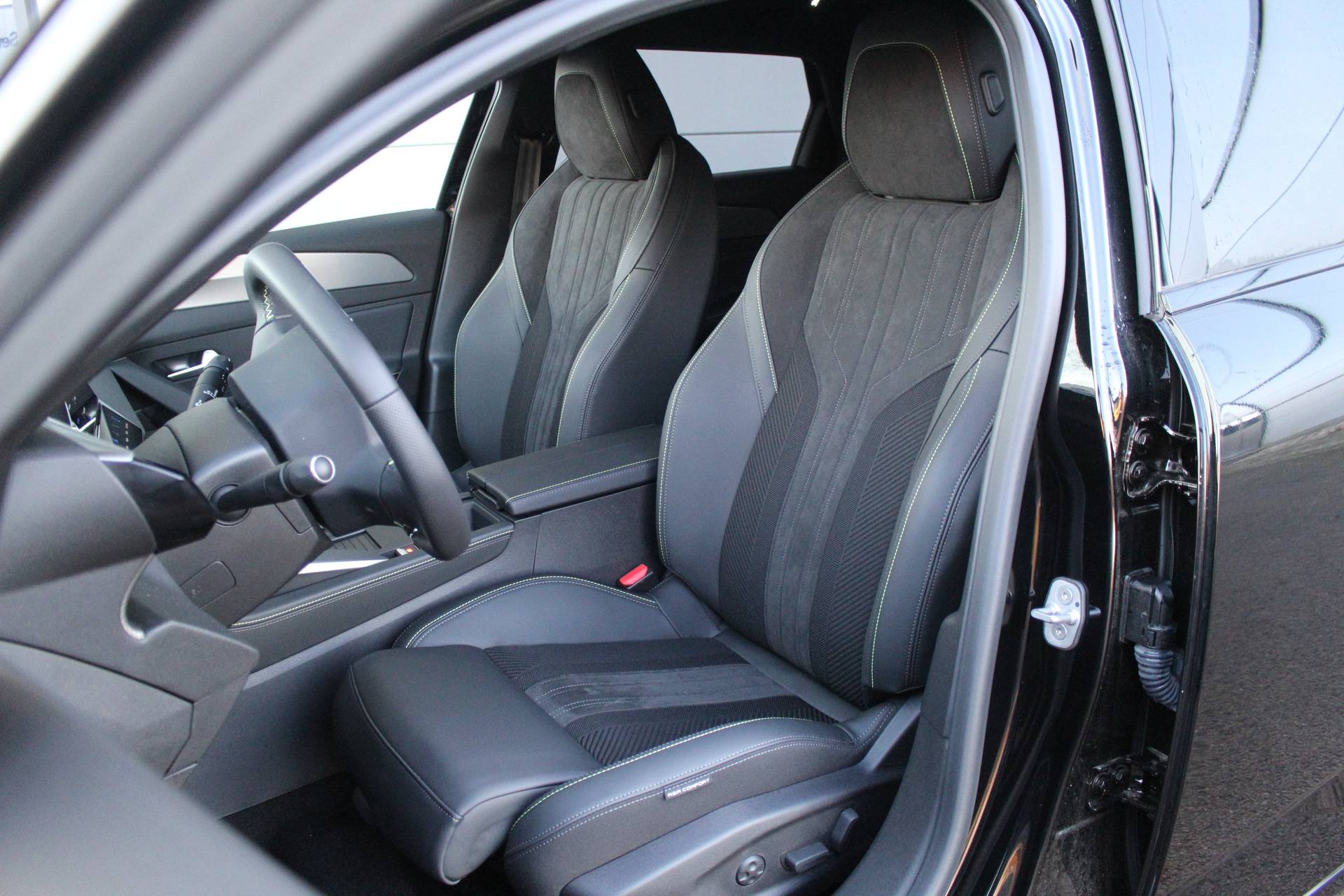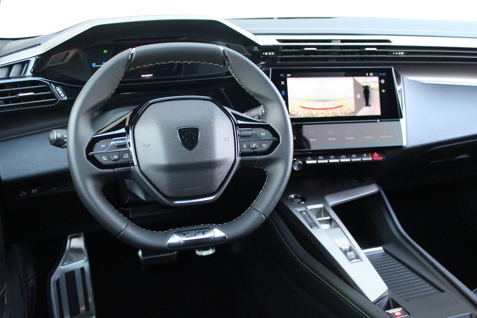 Dashboard, middenconsole en stuurwiel afgewerkt met groen stiksel