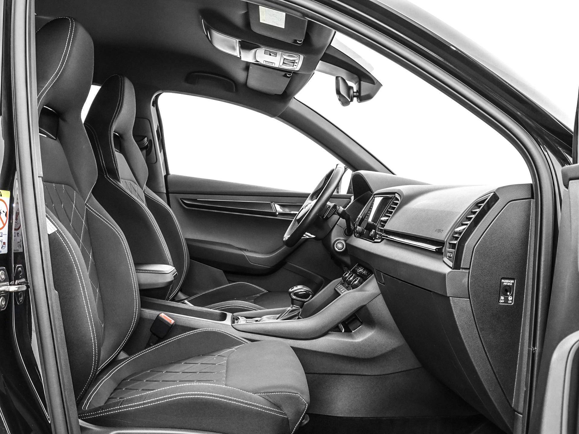 Hij is nét niet meer nieuw, dus komt-ie nu pas goed op toeren. Met alle pluspunten van een nagelnieuwe bolide. De aandrijving komt voor rekening van een benzinemotor en een automatische transmissie. De verwarmbare voorstoelen zijn een weldaad voor rug en schouders. De sportstoelen geven het interieur een super strakke look. Beknibbelen op comfort is er niet bij met deze Skoda Karoq. Hij is zelfs voorzien van een verwarmd stuurwiel! Opvallend is de geavanceerde matrix LED-verlichting met daglichtkwaliteit. De koplampen dimmen automatisch het deel van de lichtstraal waar voor- of tegenliggers in rijden. De overige segmenten blijven aan en verlichten de weg maximaal. Bij de uitrusting van deze auto horen onder meer 17 inch lichtmetalen velgen, extra getint glas, in delen neerklapbare achterbank, LED-achterlichten, verstelbare lendensteunen en verwarmde ruitensproeiers.