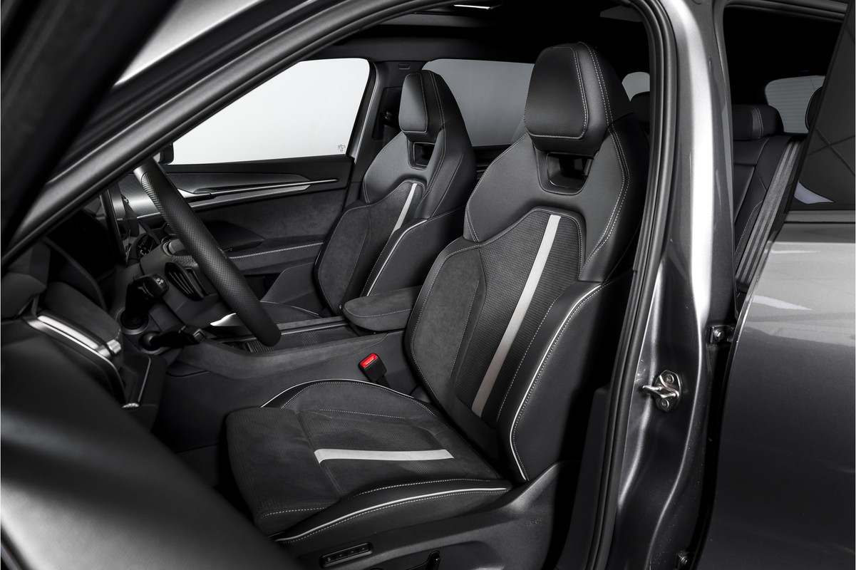 Het interieur is uitgevoerd in microvezel bekleding en voorzien van een elektrisch verstelbare bestuurdersstoel met geheugenfunctie. De afwerking is verzorgd met carbonaccenten en een volledig digitaal instrumentenpaneel, wat bijdraagt aan de moderne uitstraling.
