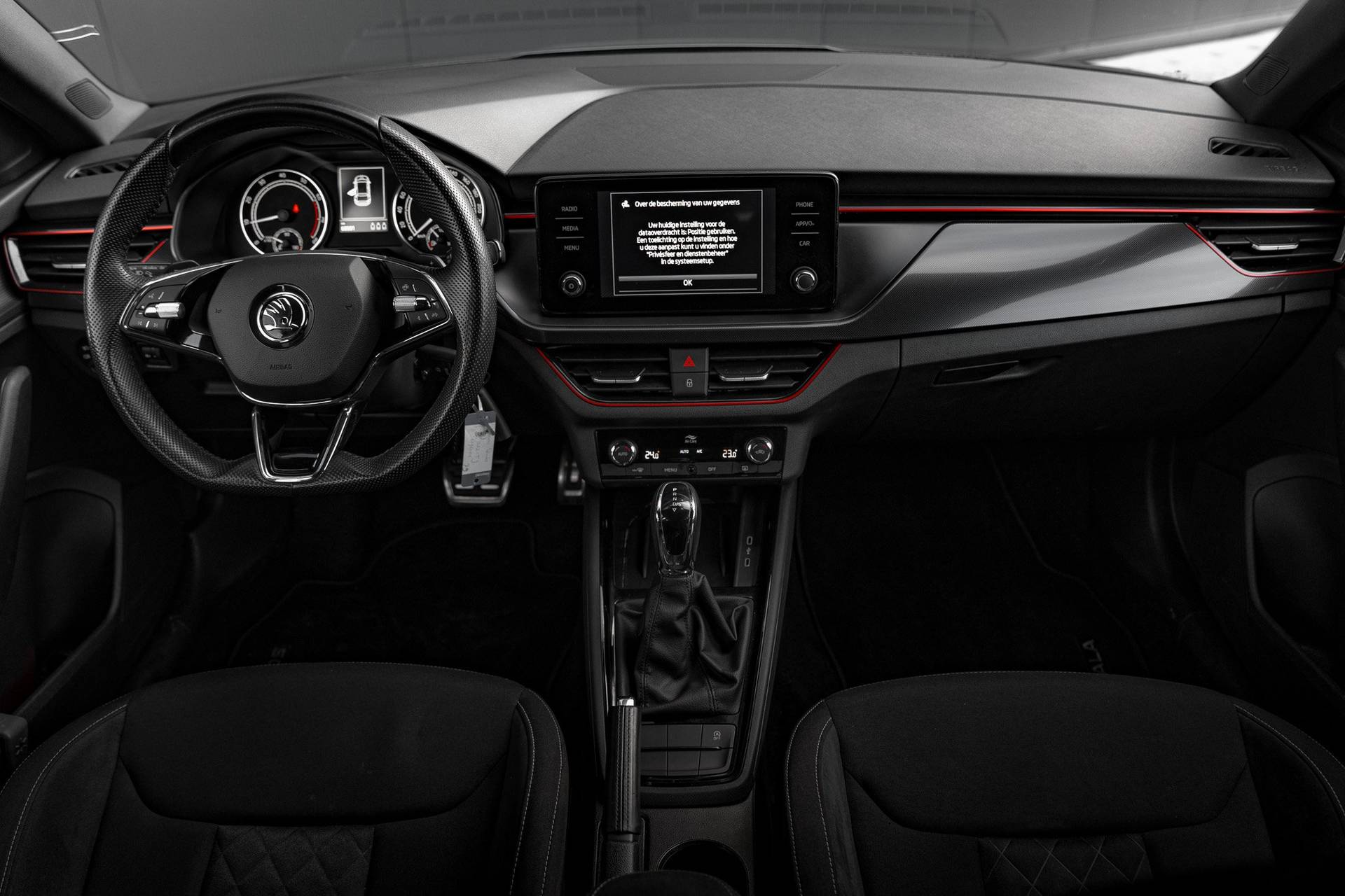 Kilometer na kilometer, bocht na bocht levert deze Skoda Scala de beste rijprestaties. De aandrijving komt voor rekening van een benzinemotor en een automatische transmissie. Sportief rijden stelt eisen aan een stevige zitpositie voor rijder en bijrijder. Vandaar de strakke sportstoelen! Tot de uitrusting behoren ook 16 inch lichtmetalen velgen, LED koplampen, dakspoiler, extra getint glas, in delen neerklapbare achterbank en LED-achterlichten. Connected Services voegt nog meer comfort en veiligheid toe aan deze auto. U kunt tijdens de rit uw ogen steeds op de weg houden, want het audio-installatiesysteem (met dab!) kunt u bedienen vanaf het stuur. De auto is voorzien van een draadloze telefoonlader, dus geen snoeren nodig om de smartphone op te laden! Met automatische airconditioning hoeft u alleen de gewenste temperatuur in te stellen. Het systeem doet de rest. De parkeersensoren waarschuwen wanneer u te krap inparkeert of dat ene paaltje niet hebt gezien. En dan is deze auto ook nog eens voorzien van sportstuur met schakelpaddels, cruise control, centrale deurvergrendeling met afstandsbediening, boordcomputer en lederen versnellingspook. Het zal u verbazen hoe deze auto in staat is om voor u de omgeving en het verkeer om u heen in de gaten te houden. Deze Skoda Scala is ook behulpzaam als het gaat om een rechte koers. Het Lane-keeping systeem signaleert en corrigeert als u onbedoeld de rijstrooklijnen dreigt te overschrijden. Forward collision warning waarschuwt voor een kop-staart botsing. Bij concentratieverlies van de bestuurder geeft vermoeidheidsherkenning automatisch een waarschuwingssignaal. Verder is deze auto uitgerust met hill hold functie, autonoom remsysteem en bandenspanningcontrolesysteem. Interesse voor deze Skoda Scala? Kom 'm dan van dichtbij bekijken. We maken graag een afspraak.