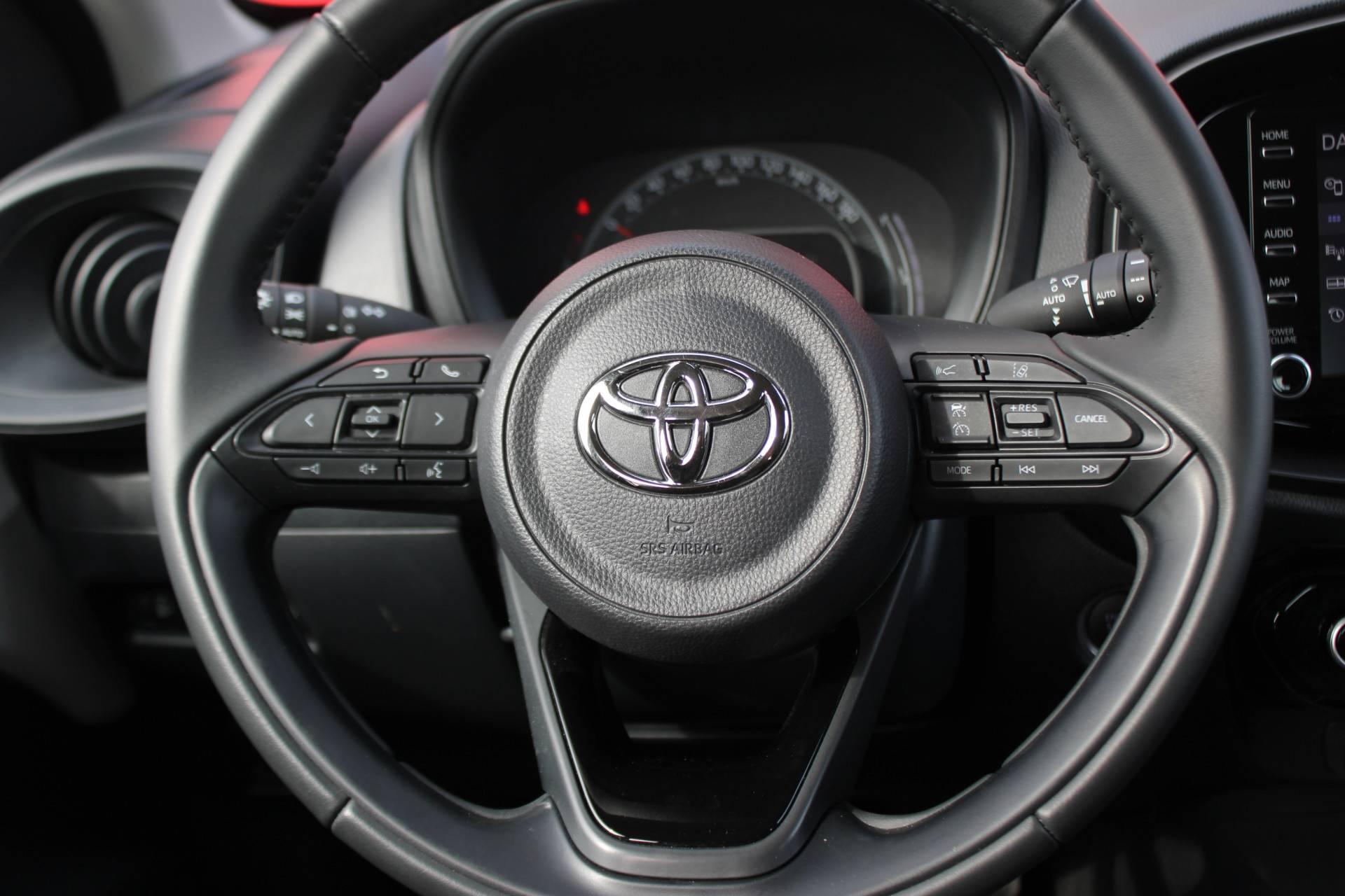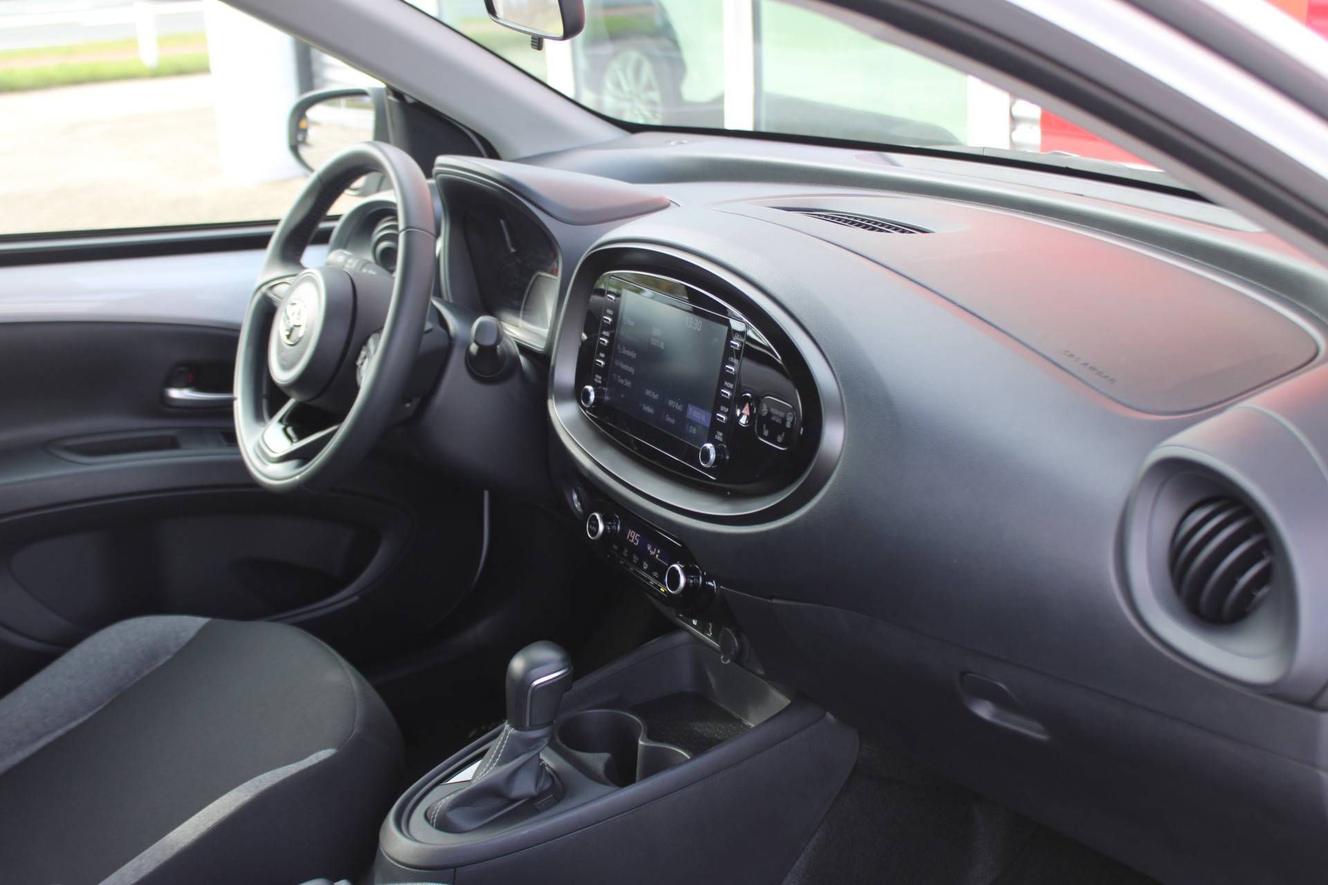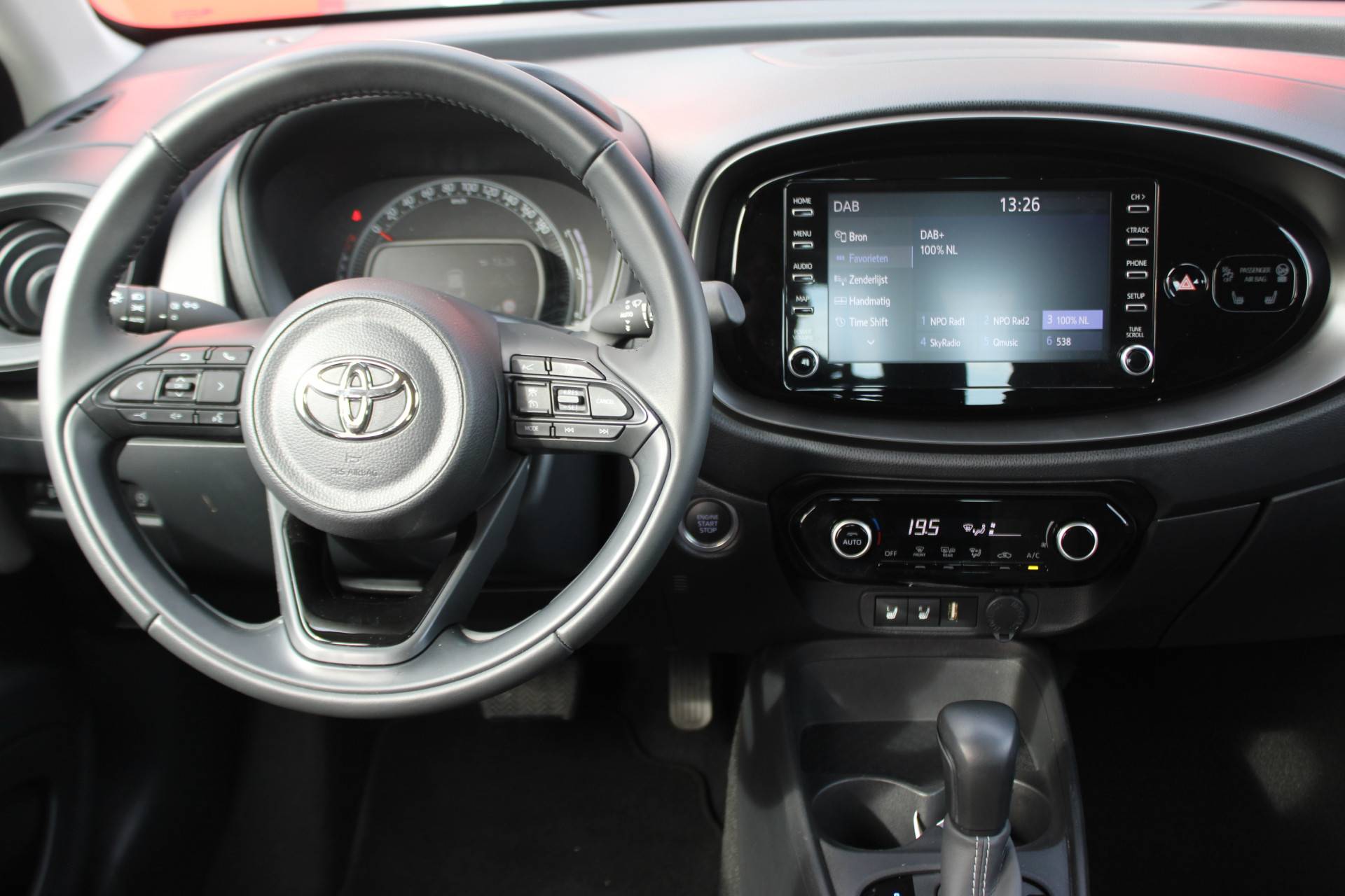Achteruitrijden en inparkeren worden een eitje dankzij de achteruitrijcamera. Adaptive cruise control is een comfortabele en veilige optie. Het systeem reguleert de snelheid en houdt automatisch afstand tot uw voorligger. Onbedoeld snijden na het inhalen gebeurt niet meer, dankzij de achteropkomend verkeer waarschuwing. Voor storingvrije digitale radio-ontvangst zorgt de DAB-ontvanger. Geen sleutel of afstandsbediening meer nodig om deze Toyota Aygo X te ontgrendelen. De sloten gaan vanzelf open als u dichtbij komt, via de sensor van de keyless entry. Ook airconditioning, lederen stuur en centrale deurvergrendeling met afstandsbediening horen tot de voorzieningen op deze auto.