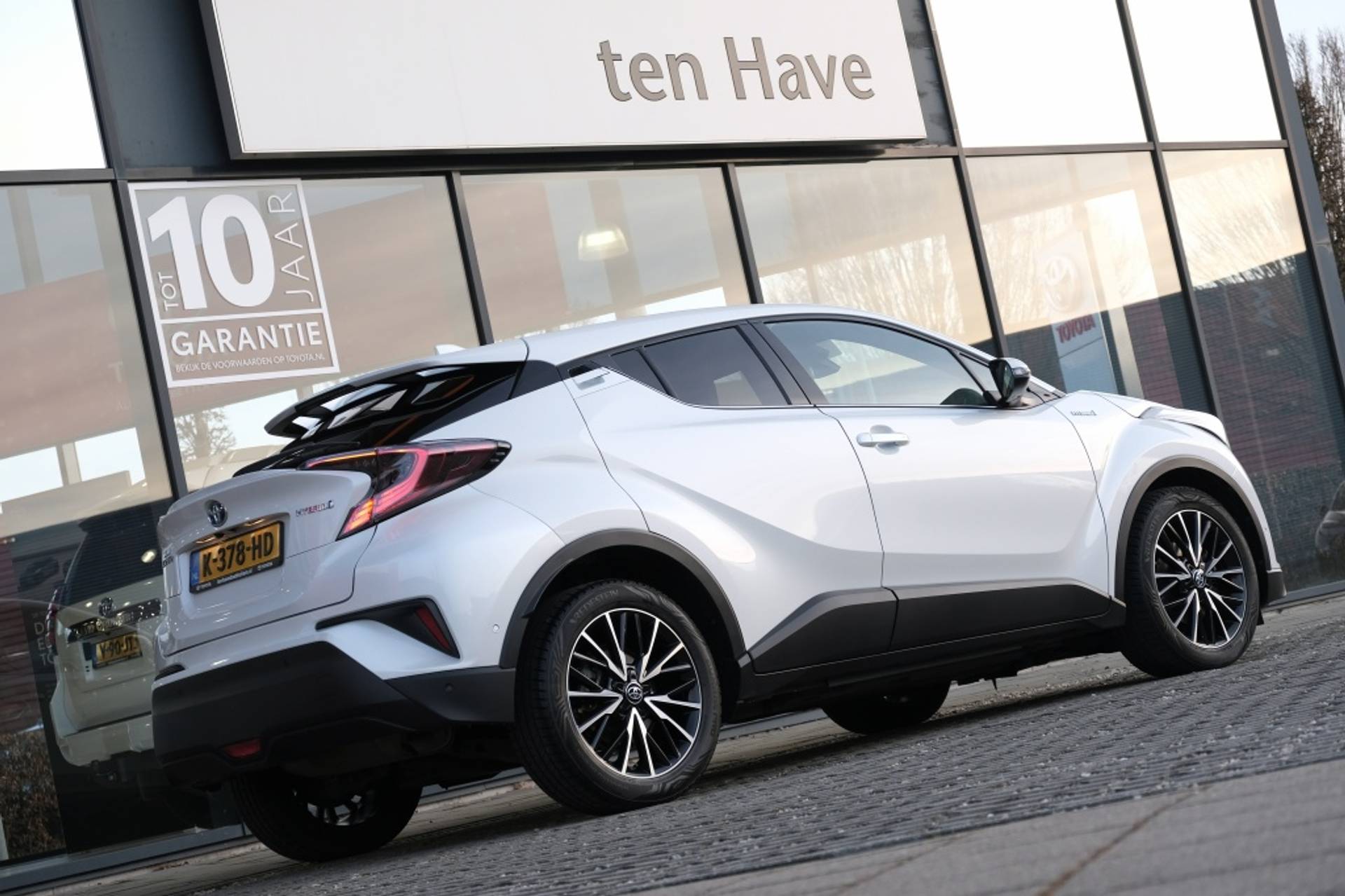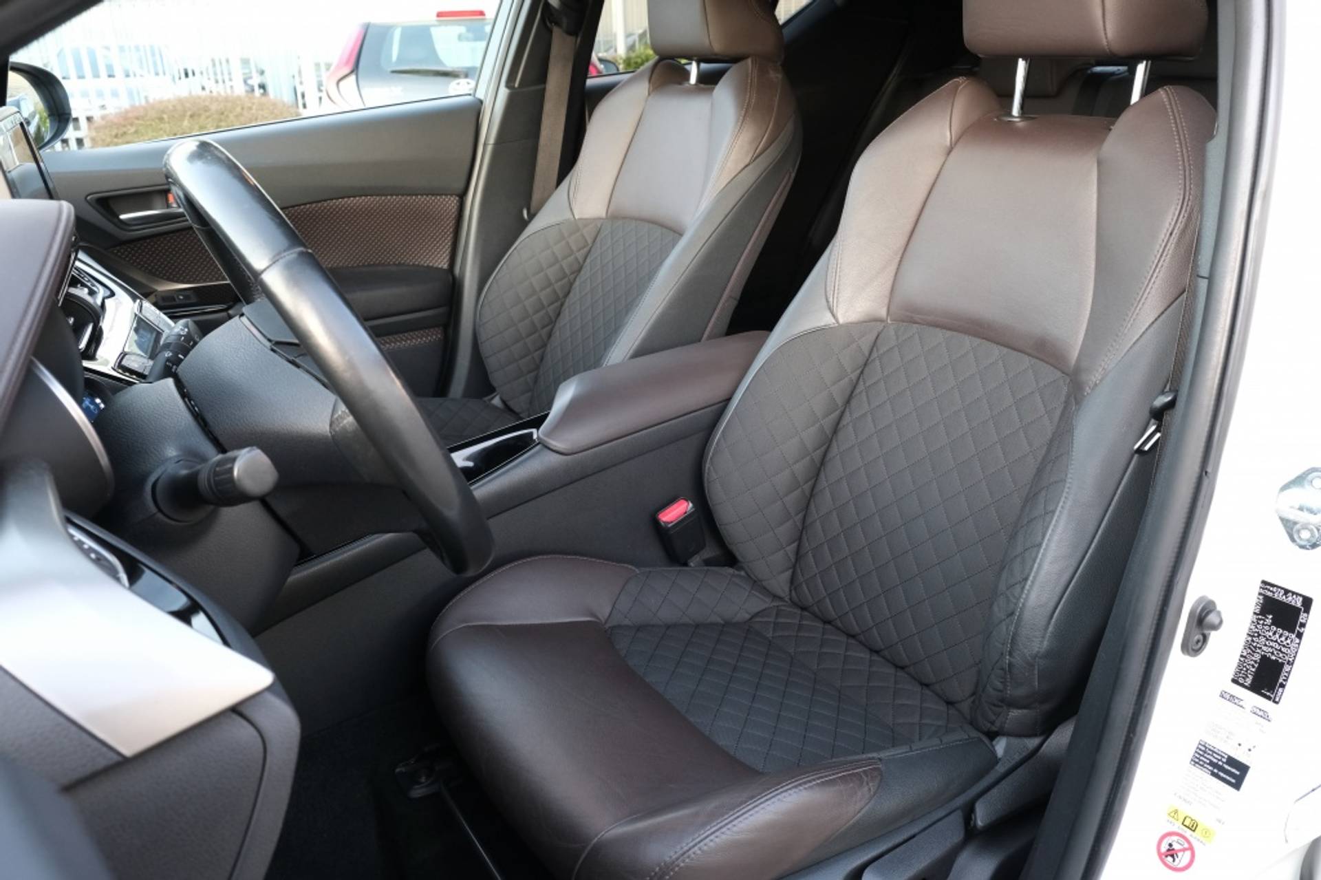 TOYOTA C-HR 1.8 Hybrid Executive Automaat | Kaartenvak op bestuurders- en passagiersstoel | Parkeersensoren voor en achter, 12 sensoren | Simple Intelligent Park Assist (SIPA); parkeerhulp | Blind Spot Monitor (BSM); dodehoekdetectie | Rear Cross Traffi c Alert (RCTA); kruisend verkeersdetectie achter | Afwerking dashboard donkerbruin soft-touch | Bekleding bruin lederen wangen met zitvlak bruin leder/grijs stof | Nano-e technologie voor zuivering van de interieurlucht | Toyota Touch With Go Plus (inclusief 3 jaar gratis kaartupdates) | Digitale radio (DAB+) | Afwerking middenconsole metallic zwart | Deurgrepen interieur chroom afwerking | Elektrisch verstelbare lendensteun | LED interieurverlichting deurgreep en bekerhouder | Stoelverwarming bestuurders- en passagiersstoel | Smart entry-systeem (bestuurder, passagier en koff erruimte) | Startknop | B-stijl zwart gelakt | Buitenspiegels elektrisch verstelbaar- verwarmbaar en inklapbaar | Privacy glass achterruit achterklep | Privacy glass zijramen | 4,2” kleurendisplay | 6 speakers | Multimediasysteem Toyota Touch® 2 | Parkeerhulpcamera achter met hulplijnen | Automatisch dimmende binnenspiegel | Automatische airconditioning | Lederen stuurwiel met bediening voor o.a. audio, Bluetooth® en cruise control | Startknop (alleen i.c.m. 1.8 Hybrid) | Regensensor | Road Sign Assist (RSA); verkeersbordenherkenning | Buitenspiegels elektrisch verstelbaar en verwarmbaar | Mistlampen voorzijde | Buitenspiegels elektrisch verstelbaar en verwarmbaar | ‘Follow me home’ verlichting | LED dagrijverlichting | Afwerking dashboard zwart soft-touch | Bestuurdersstoel met hoogteverstelling | Donkere hemelbekleding | Elektrisch bedienbare ramen vóór en achter | Handbediende airconditioning | Stuurwiel met bediening voor Toyota Safety Sense | 7 airbags waaronder knie-airbag | Schemersensor | Snelheidsbegrenzer | Toyota Safety Sense® » Adaptive Cruise Control (ACC) » Automatic High Beam (AHB); automatische schakeling groot- en dimlicht » Lane Depart Alert (LDA) met automatische stuurcorrectie » Pre-collision System (PCS) met voetgangersherkenning | Veiligheidssystemen: ABS, EBD, BA, VSC, en TRC | 3,7” monochrome info display | 4 speakers | Bluetooth® handsfree systeem | Bluetooth® music streaming | Radio/CD – speler met AUX/USB aansluiting | Tot 10 jaar garantie |