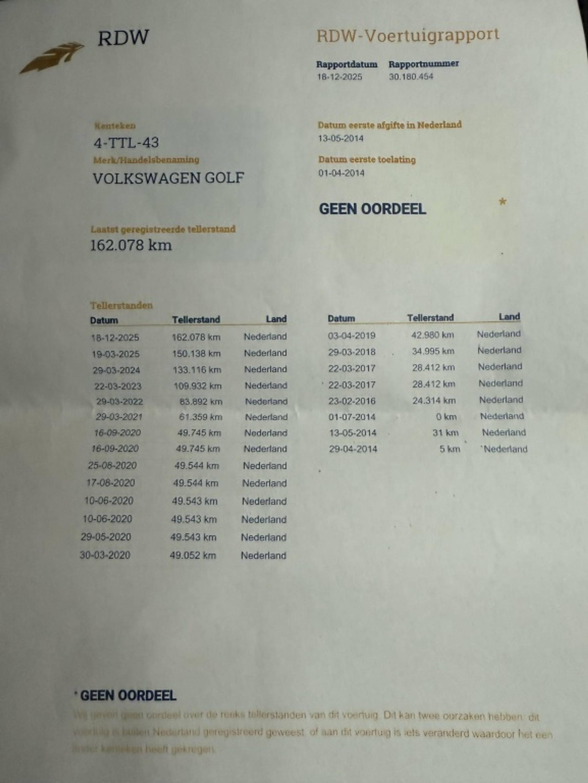 ✓ APK bij aflevering: J