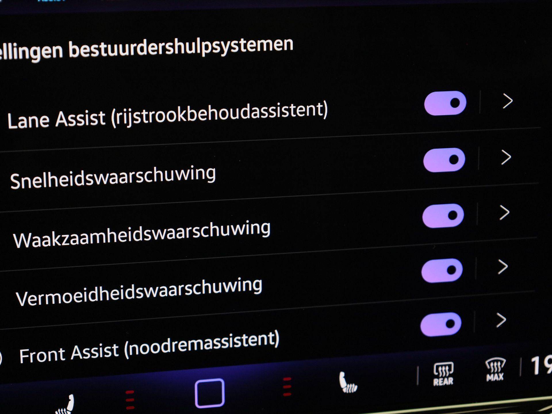 In deze auto zijn verschillende technologieën aanwezig die voor u het verkeer en de omgeving in de gaten houden en die desnoods ook kunnen remmen of bijsturen. In het instrumentarium laat de verkeersborddetectie de actuele verkeersborden zien. Indien u onbedoeld de rijstrook lijkt te verlaten, reageert het Lane-keeping systeem meteen en corrigeert. Het laatste wat u wilt is dat u achter het stuur indommelt. Om dat te voorkomen is deze auto uitgerust met vermoeidheidsherkenning. Bovenop deze veiligheidsfeatures heeft deze Volkswagen bovendien dodehoekdetectie, front assist, hill hold functie, brake assist en bandenspanningcontrolesysteem.