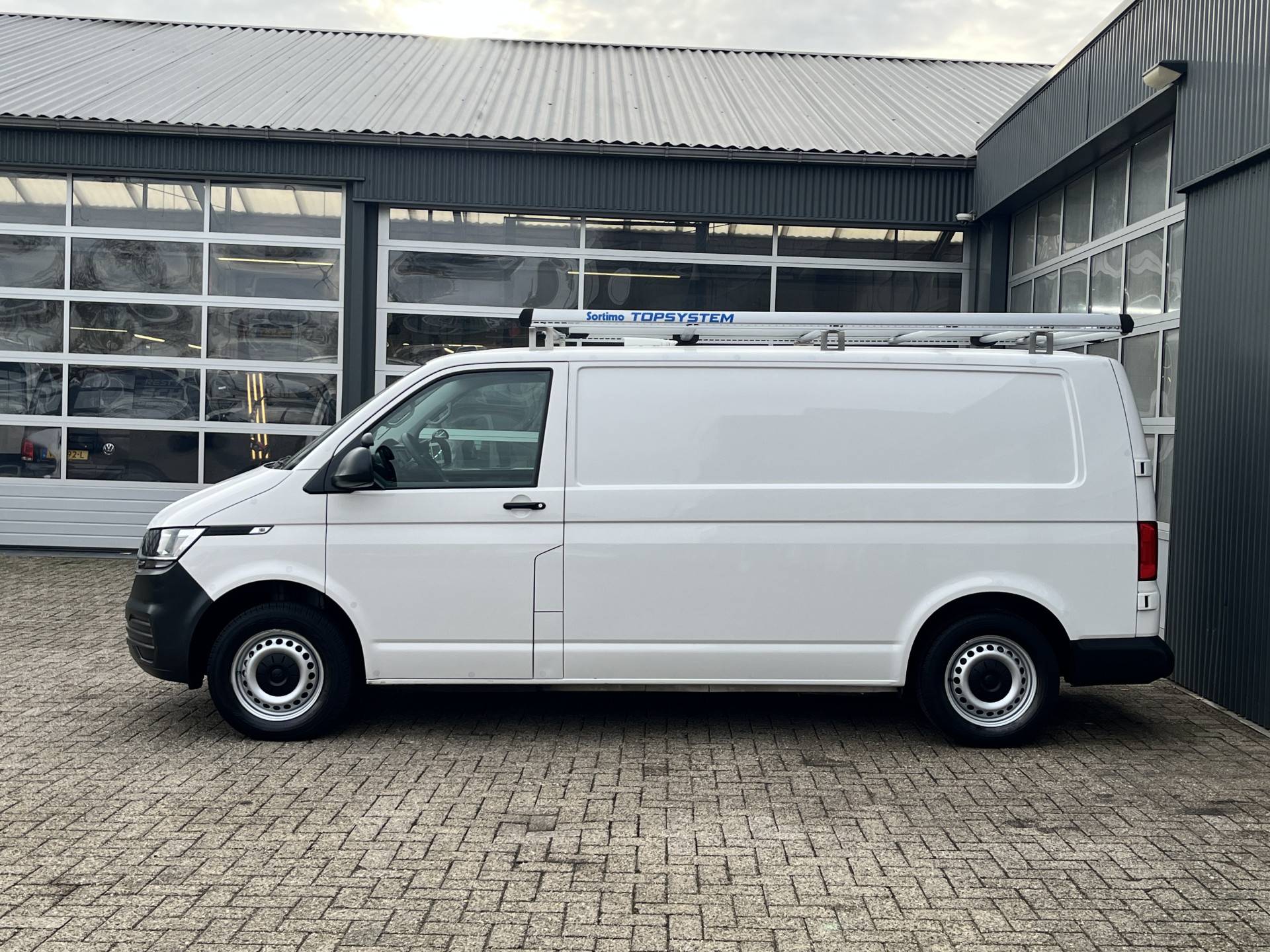 Een zeer nette Volkswagen Transporter 2.0 TDI 110pk L2H1 met Airco Cruise controle Trekhaak 2200kg trekgewicht Kastinrichting Imperiaal Schuifdeur Parkeerhulp achter Telefoonverbinding Euro 6 1e eigenaar Sortimo