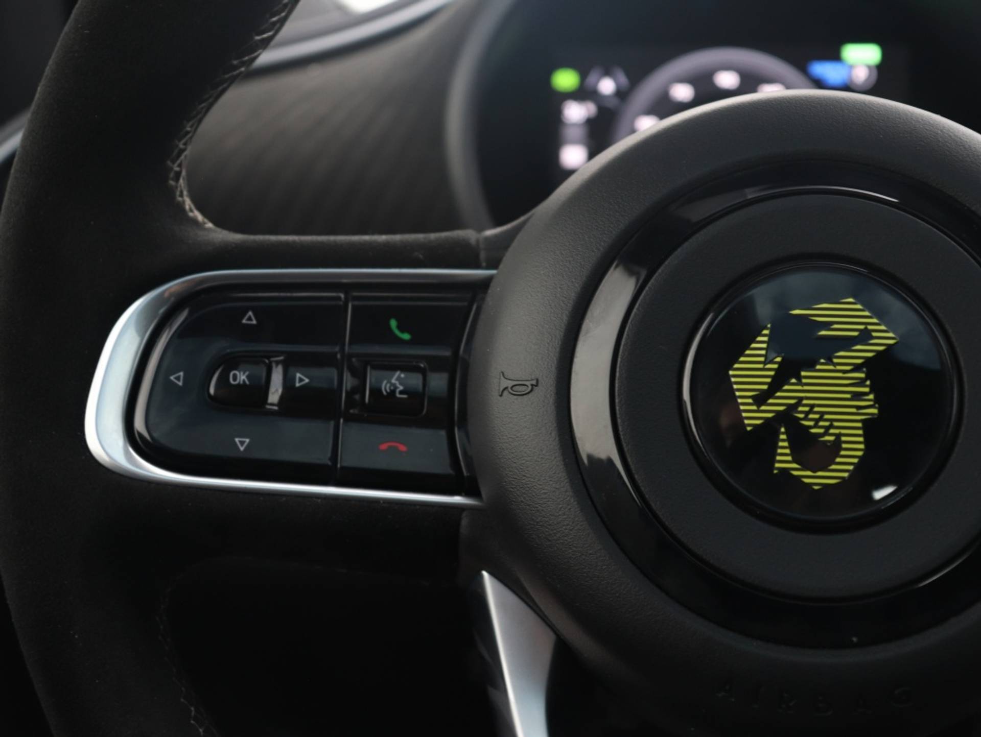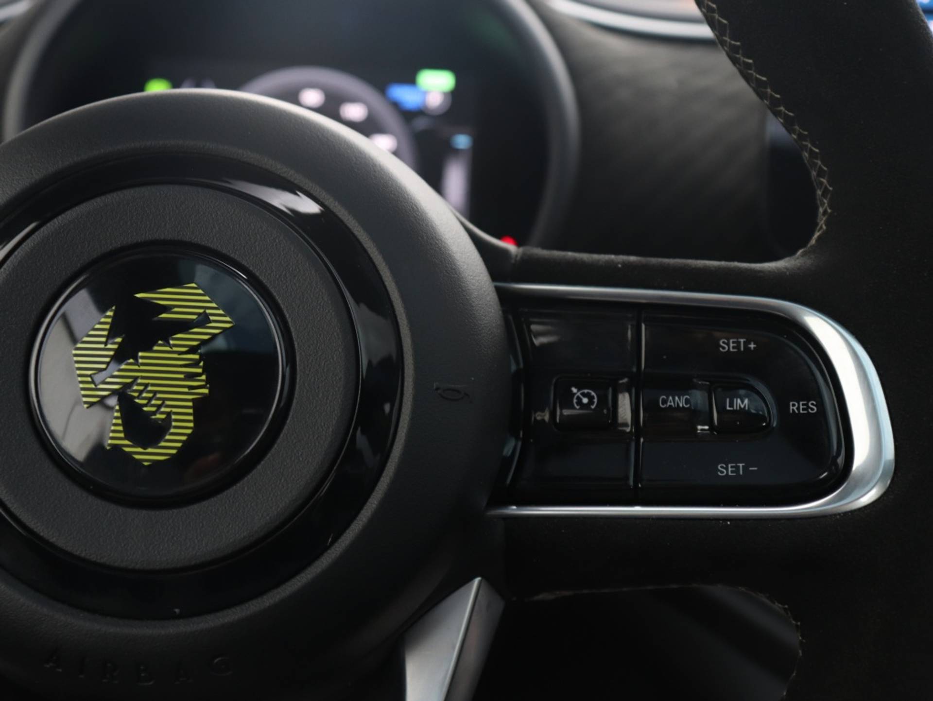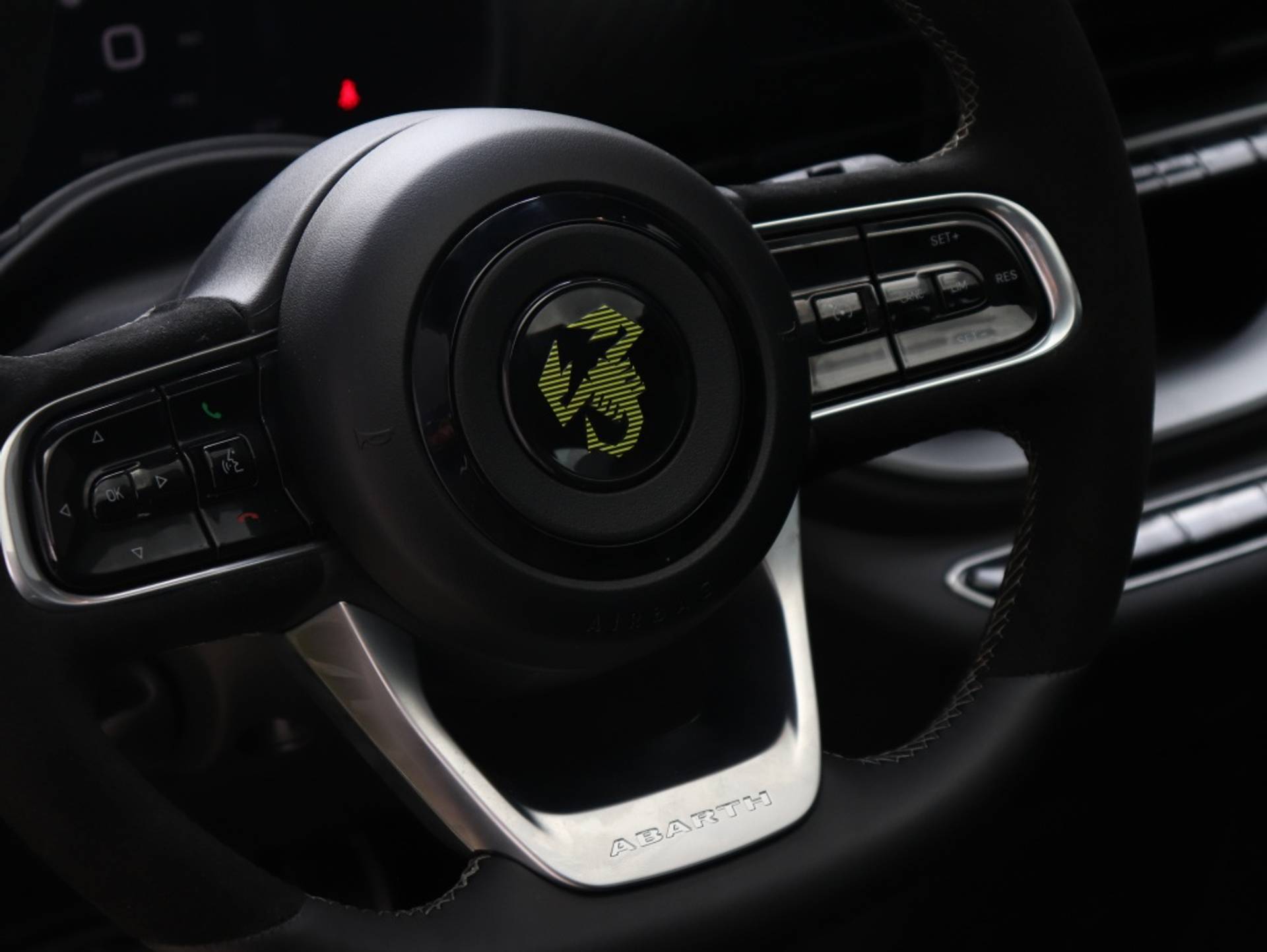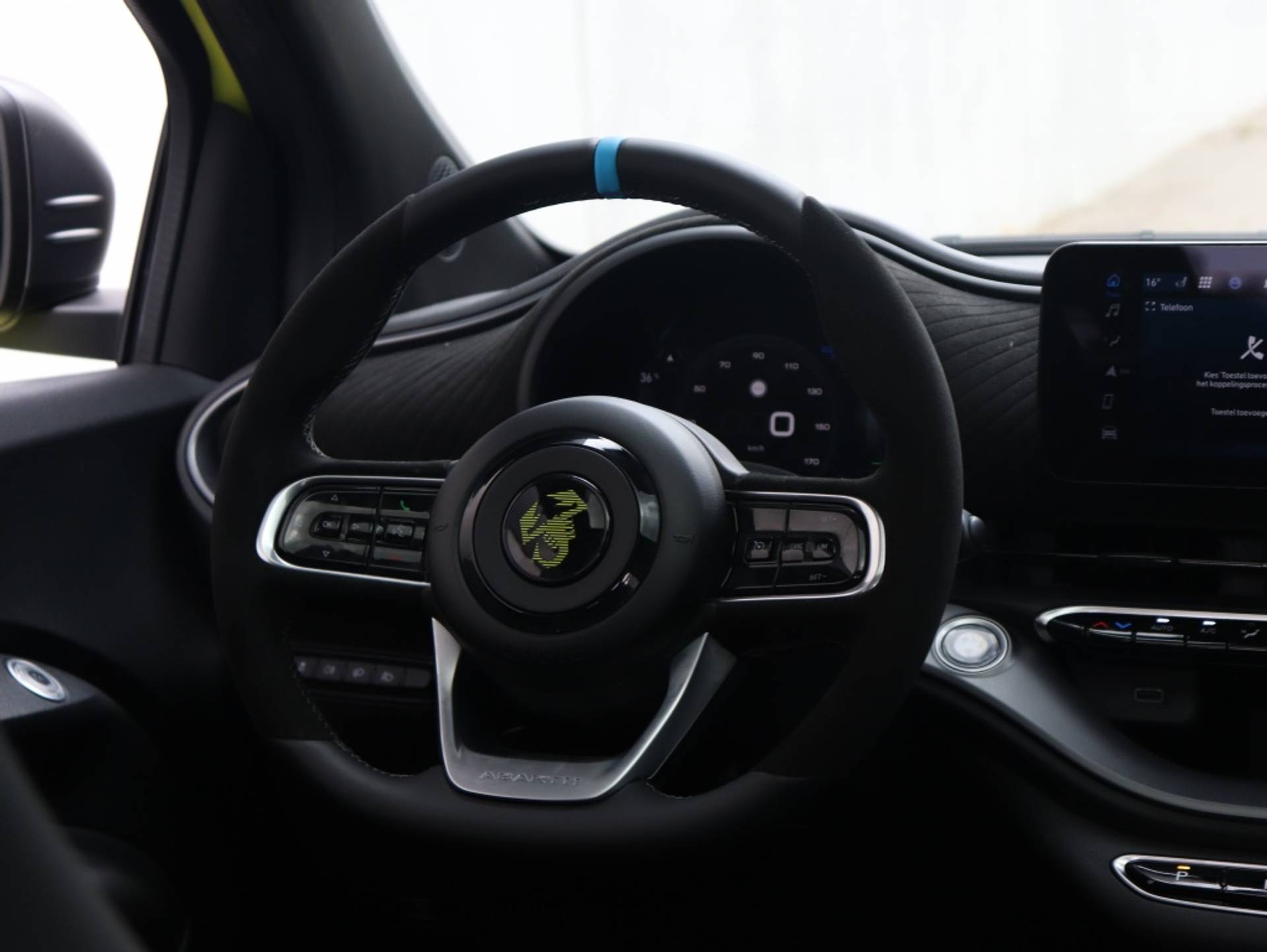 Alcantara reliëf dashboardpaneel: De met Alcantara beklede sportstoelen en het eveneens deels met Alcantara beklede stuurwiel creëren een sportieve ambiance in de beste Abarth-traditie. Het dashboardpaneel is afgewerkt met ditzelfde oorspronkelijk voor de racerij ontwikkelde bekledingsmateriaal.