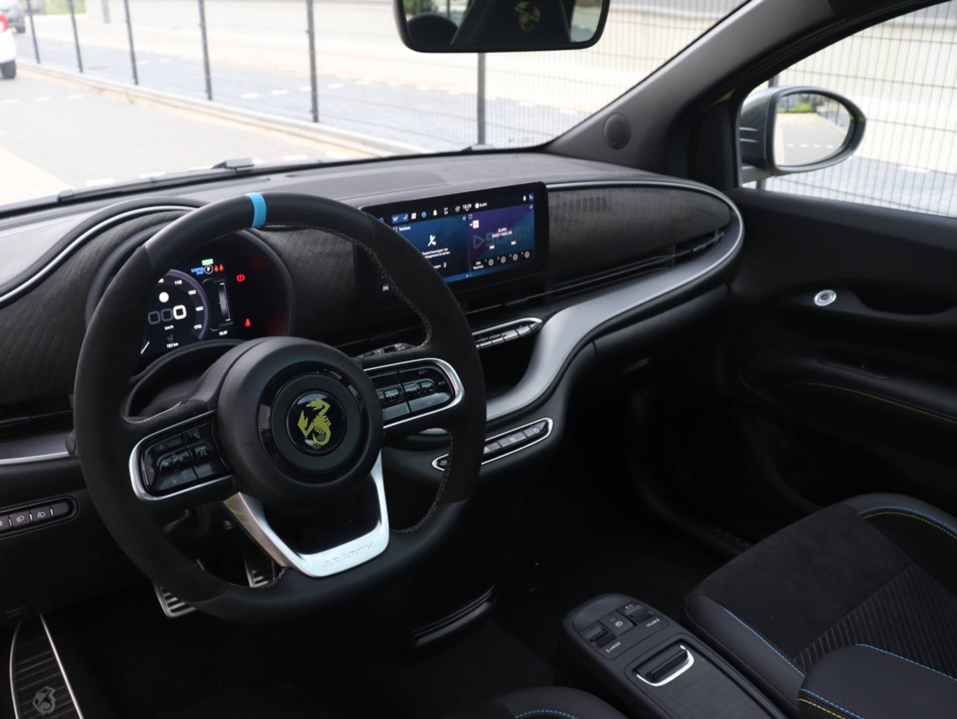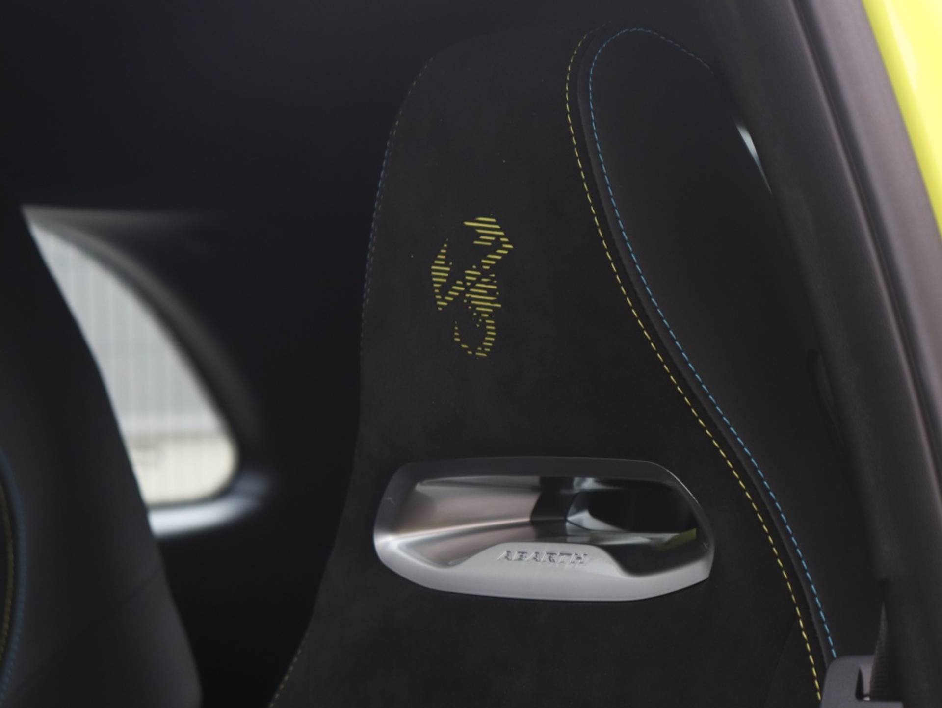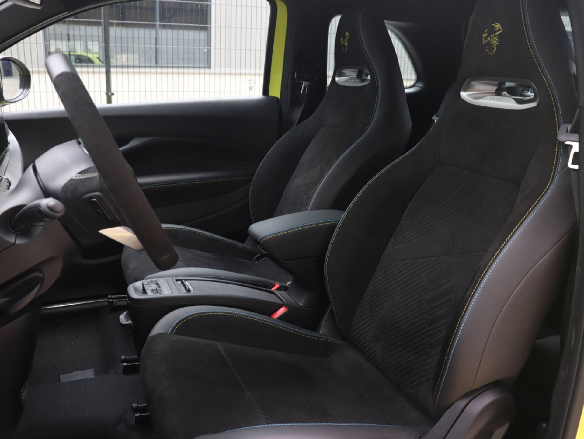 PERFECTE ONDERSTEUNING: De sportstoelen met geïntegreerde hoofdsteun en bekleding van Alcantara combineren comfort met een perfecte ondersteuning van het lichaam. Het gifgroen gelaserde schorpioen-logo maakt duidelijk dat ook deze elektrische Abarth het venijn bezit dat hem tot een échte Abarth maakt.