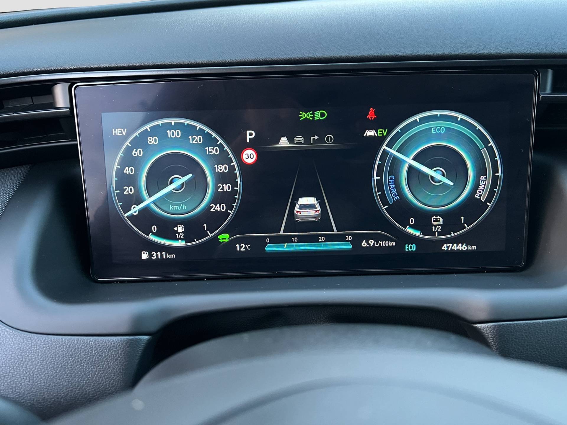 Stijlvol en veelzijdig, dat zijn misschien wel de belangrijkste kenmerken van de Hyundai Tucson. Dit exemplaar is bovendien voorzien van verschillende systemen die het autorijden aangenamer en veiliger maken. Een hybride auto zoals deze, wordt aangedreven door een verbrandingsmotor en een elektromotor. Daardoor is de auto zuinig en vriendelijk voor het milieu. U zult absoluut de luxe waarderen van de stoelverwarming, verwarmbare achterbank, en het verwarmbare stuur dat inbegrepen is in dit voertuig. De achterklep opent automatisch met een druk op de knop. Handig als u met volle handen staat. In deze Hyundai profiteert u onder andere ook van: 19 inch lichtmetalen velgen, LED koplampen, zwarte hemelbekleding, donker getint glas achter, in delen neerklapbare achterbank en LED-achterlichten. Via het digitale dashboard bent u permanent op de hoogte van alle informatie die u nodig heeft voor een veilige rit. Met de 360 graden camera op deze auto wordt parkeren in smalle parkeerplekken een makkie dankzij het optimale zicht dat het apparaat levert. Met adaptive cruise control houdt deze auto automatisch afstand tot uw voorligger. Filerijden zal nooit een pretje worden. Maar met de file assistent wordt het wél relaxter. Deze geavanceerde optie zorgt dat u automatisch de juiste afstand tot de voorligger houdt en remt bovendien als de rij tot stilstand komt. De conditie van deze auto is 24/7 inzichtelijk dankzij Connected Services. De uitrusting van deze auto is met dashboard met spraakbediening, premium audiosysteem, full map navigatiesysteem, kruisend verkeer detectie, automatische airconditioning en draadloos opladen behoorlijk compleet. Zoals u mag verwachten van deze Hyundai Tucson is hij uitgerust met een reeks aan actieve veiligheidssystemen. Wat deze auto ook kan, is lezen. Hij 'leest' voor u de verkeersborden tijdens de rit en attendeert u erop door ze op het dashboard te projecteren. Indien u onbedoeld de rijstrook lijkt te verlaten, reageert het Lane-keeping systeem meteen en corrigeert. Actieve dodehoekdetectie geeft een waarschuwingssignaal wanneer een ander voertuig in uw dode hoek rijdt. Dit verkleint de kans op een aanrijding. De veiligheid van deze auto wordt verder verhoogd door forward collision warning system, hill hold functie, vermoeidheidsherkenning, autonoom remsysteem en bandenspanningcontrolesysteem. Om deze auto echt te ervaren, moet u beslist een proefrit maken. Mail ons nu of bel ons, dan maken we snel een afspraak.