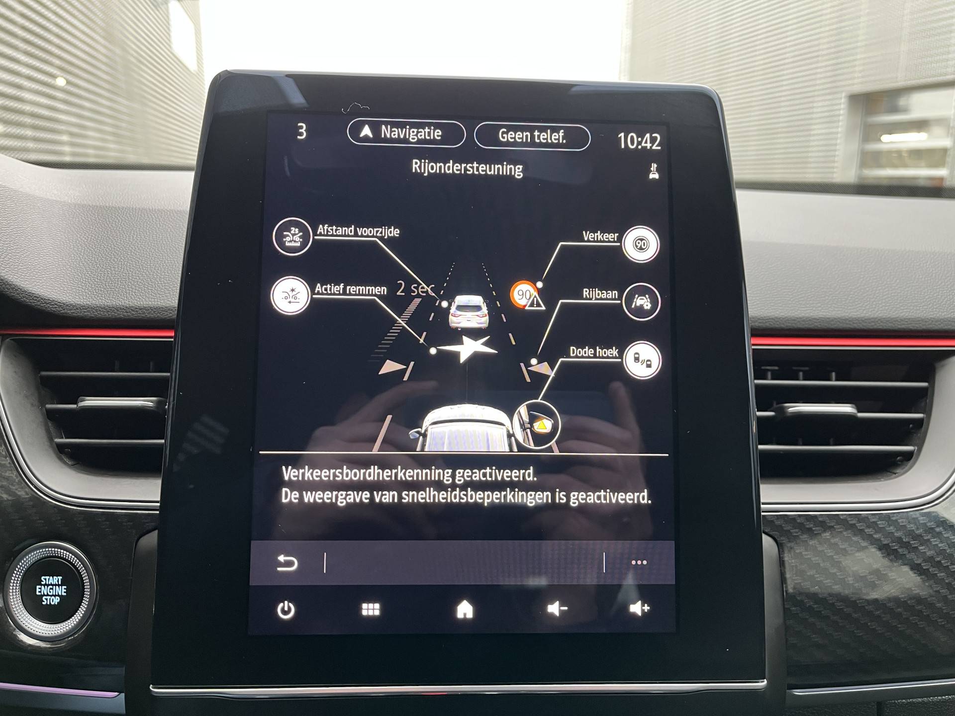 In deze auto zijn verschillende technologieën aanwezig die voor jou het verkeer en de omgeving in de gaten houden en die desnoods ook kunnen remmen of bijsturen. In het instrumentarium laat de verkeersborddetectie de actuele verkeersborden zien. Ongemerkt buiten de rijstrook raken? Nee hoor, het Lane-keeping systeem waarschuwt en corrigeert. Het forward collision warning-systeem is constant alert en detecteert via sensor de afstand tot voorliggers. Wordt die te klein, dan volgt een automatische waarschuwing. In deze Renault vinden we verder een dodehoekdetectie, hill hold functie, autonoom remsysteem en bandenspanningcontrolesysteem.