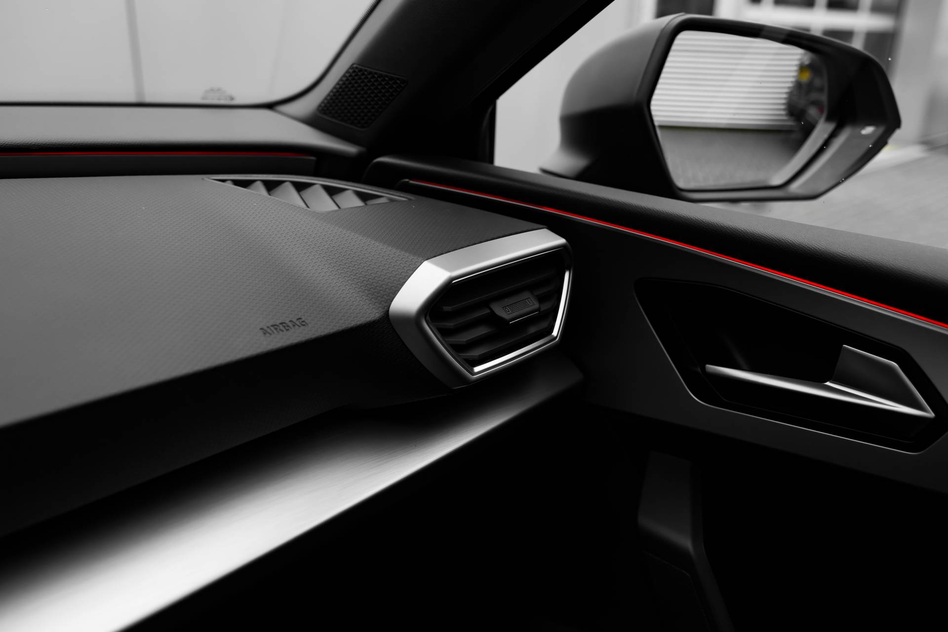 Interieur: Bekleding stof Two-tone Grey & Lava Red stiksels