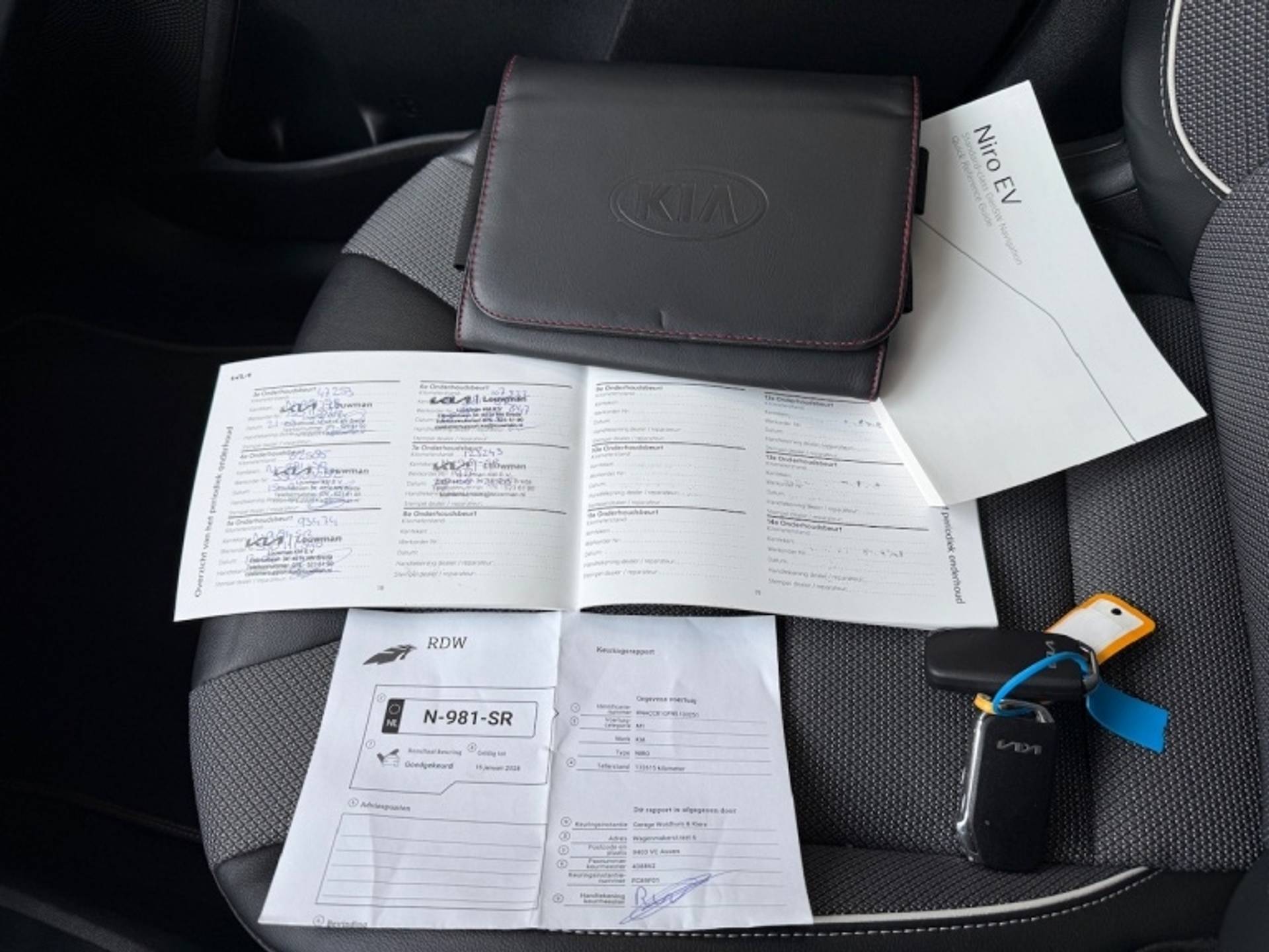 Deze Kia E-niro heeft bij 123.243km op 28-08-2025 nog een onderhoudsbeurt gehad bij de dealer.