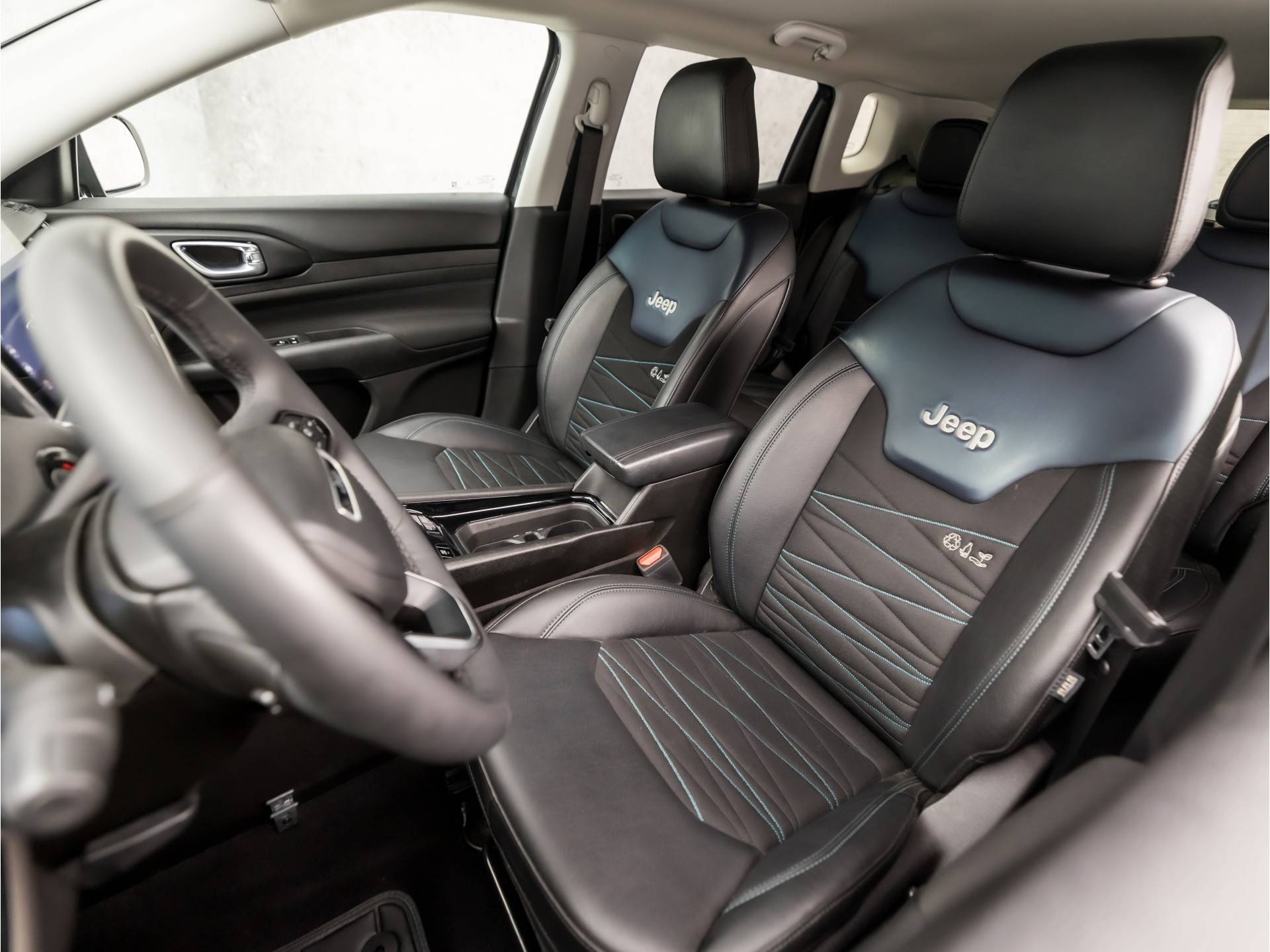 Aan boord van deze Jeep houden verschillende geavanceerde systemen voor u de weg in de gaten. Ze waarschuwen u voor noodsituaties en kunnen in een aantal gevallen ook zelf ingrijpen. Dat de auto steeds meer taken van de bestuurder overneemt, merkt u bijvoorbeeld aan het systeem voor verkeersbord-detectie in deze auto. Met het Lane-keeping systeem komt u nooit per ongeluk buiten de rijstrook. In een noodsituatie waarschuwt forward collision warning bij een dreigende aanrijding met een voorligger. In deze Jeep vinden we verder een dodehoekdetectie, hill hold functie, vermoeidheidsherkenning, autonoom remsysteem en bandenspanningcontrolesysteem.